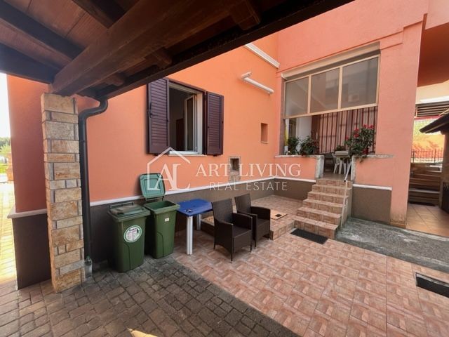 The apartment on the ground floor with a total area of 69 m2 consists of: an entrance hall, a living room with an open kitchen and dining room, 2 bedrooms, a bathroom, a storage room and a carport with a total area of 48 m2 and a spacious covered terrace with a view of the garden.