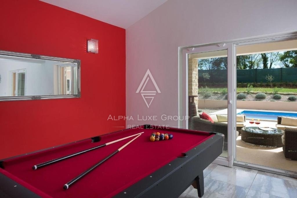 The ground floor is occupied by an ample open space combining a corner with a pool table, living room, dining room, and kitchen with access to a spacious covered terrace. Two bedrooms with ensuite bathrooms, guest toilets, and storage are on the same floor.