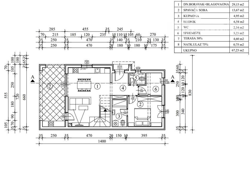Prizemlje kuće sastoji se od prostranog dnevnog boravka povezanog s kuhinjom i blagovaonicom, spavaće sobe s vlastitom kupaonicom, hodnika, dodatnog WC-a te spremišta.