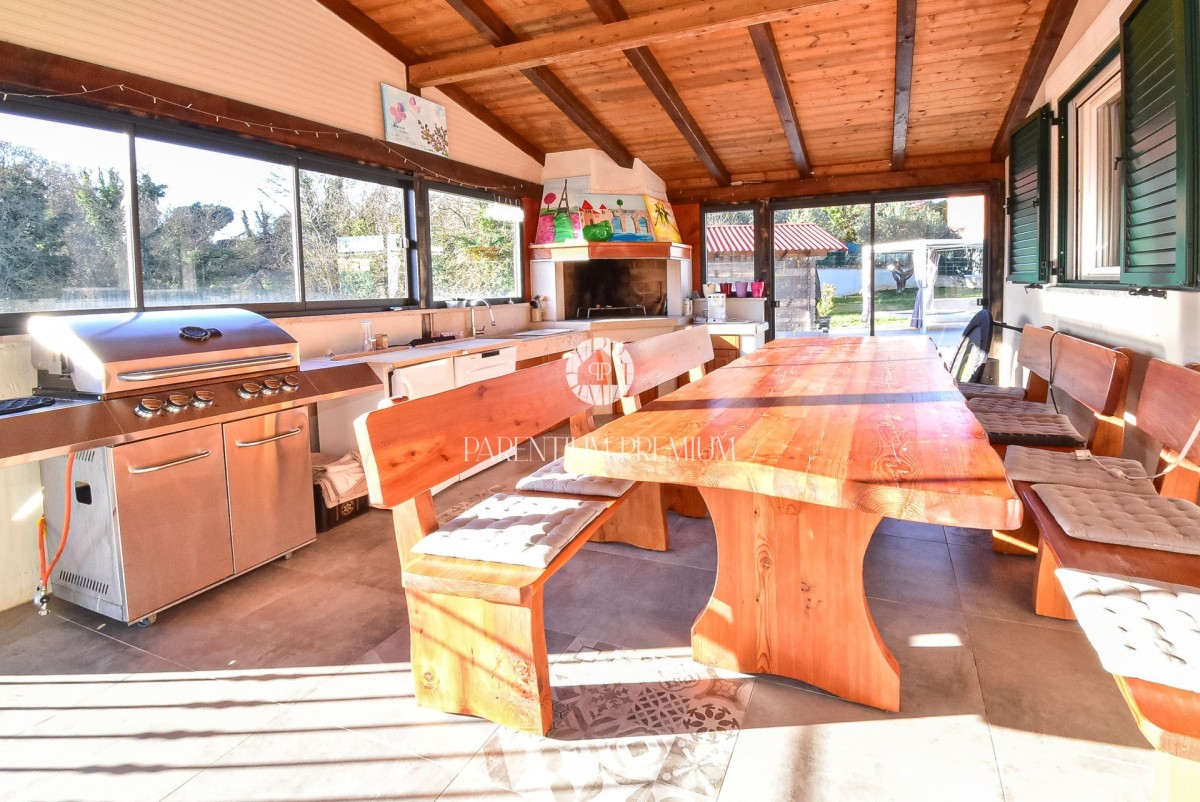 Poseban naglasak stavljen je na veliku natkrivenu terasu zatvorenu staklenim stijenama, opremljenu ljetnom kuhinjom i blagovaonicom – idealno mjesto za druženja tijekom cijele godine, s direktnim izlazom na bazen i sunčalište.
