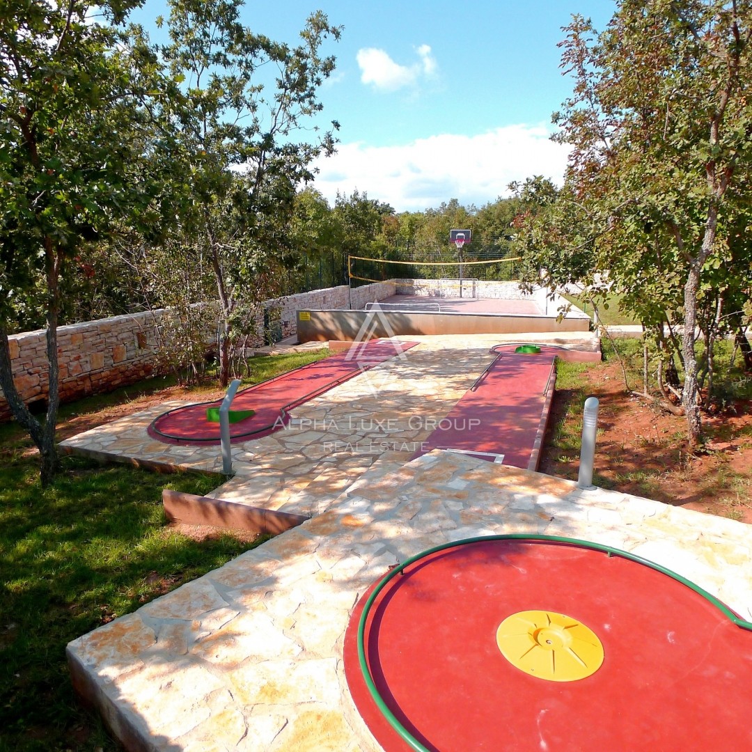 Na prostranoj okućnici nalazi se bazen površine 36 m2, ležaljke za sunčanje, natkrivena terasa s roštiljem, sadržajno igralište za djecu i mini golf teren. Osim toga, na imanju su četiri natkrivena parkirna mjesta.