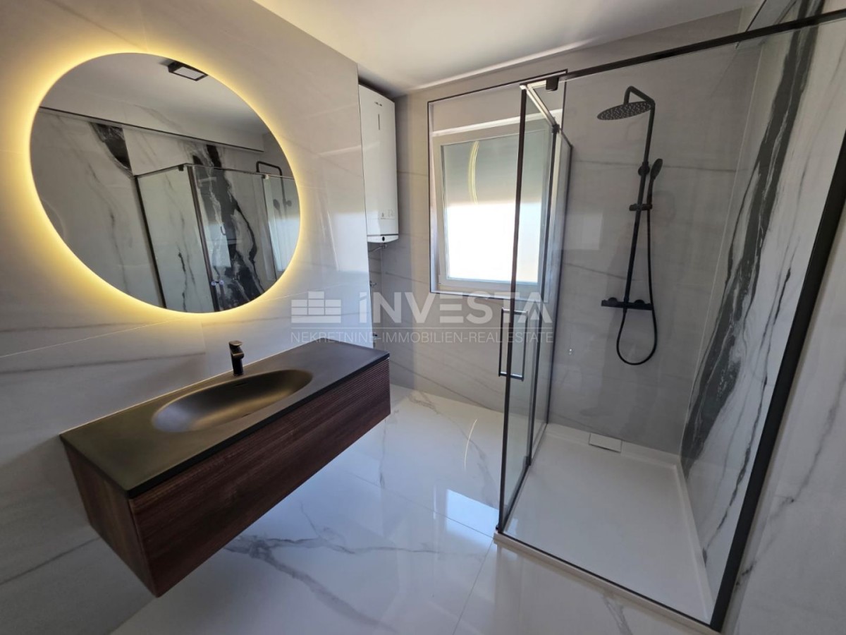 Kvaliteta gradnje i opreme vidljiva je u svakom detalju. PVC stolarija s aluminijskim roletama i komarnicima, klima uređaji u svim prostorijama te podno grijanje s individualnim termostatima osiguravaju ugodnu temperaturu kroz sva godišnja doba. Kvalitetna keramika dodatno doprinosi modernom i urednom izgledu interijera.