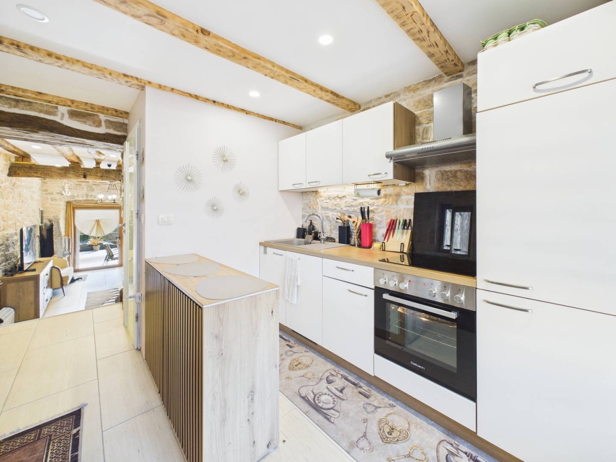 Prizemlje: Srce kuće čini otvoreni dnevni boravak sa suvremenom kuhinjom koja se otvara na prostranu natkrivenu terasu. U ovoj etaži nalazi se i WC.