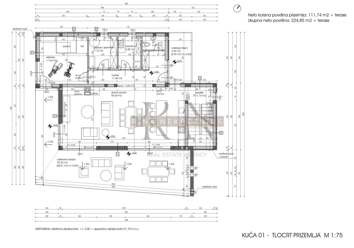PRIZEMLJE- gostinjski wc, gospodarska soba (praonica), tehnička soba i spremište, wellness soba sa saunom i tušem i svojim izlazom na glasvnu natkrivenu terasu, open space dnevni boravak sa kuhinjom i blagavaonicomod čak 55m2 i izlazom na prekrasnu natrivenu terasu podne površine 58.52m2.