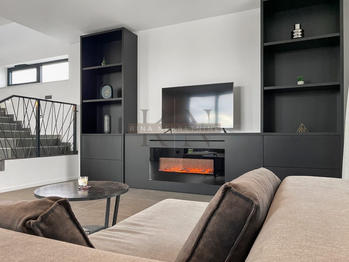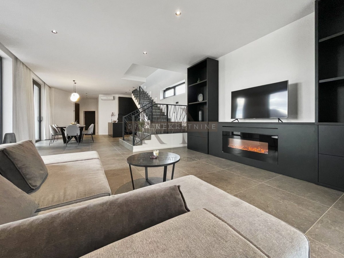 Ulazni prostor koji vodi ka open space kuhinji sa blagavaonicom i dnevnim boravkom sa izlazima na vanjsku terasu sa opremljenim sučalištem, lounge zoni, natkrivenoj ljetnoj kuhinji i pogledom na bazen od 50m2.