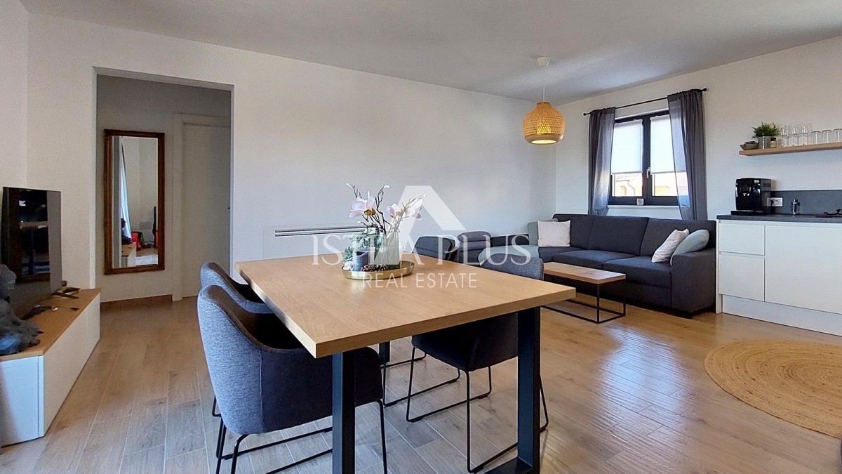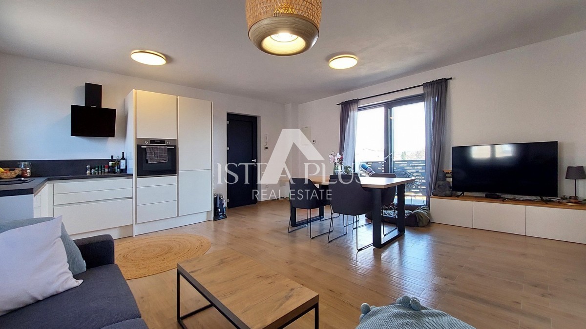 Prekrasan , osunčan , moderni stan u bližoj okolici Poreča površine 63 m², sastoji se od dnevnog dijela, natkrivene terase, 2 spavaće sobe i kupaonice. Stan se nalazi na prvom katu zgrade u kojoj se nalaze samo dva stana, ima podno grijanje u cijelom stanu (dizalica topline), klima uređaj u dnevnom boravku i u spavaćim sobama i jedno parkirno mjesto ispred zgrade. Stan je izgrađen 2021. godine, odlično je očuvan, udaljen je ca 3 km od mora i 2,5 km od centra Poreča, do supermarketa ima ca 1 km.