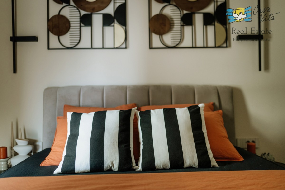 Ova moderno projektirana kuća obuhvaća tri spavaće sobe, nudeći dovoljno prostora za obitelj ili goste. Prostor je pažljivo osmišljen kako bi omogućio maksimalnu funkcionalnost i udobnost, a dizajnerski elementi interijera dodatno naglašavaju kvalitetu i estetiku. Kuhinja s aparatima, perilica posuđa, perilica rublja, TV, krevet i radni stol uključeni su u opremu, čime se dodatno olakšava svakodnevni život.