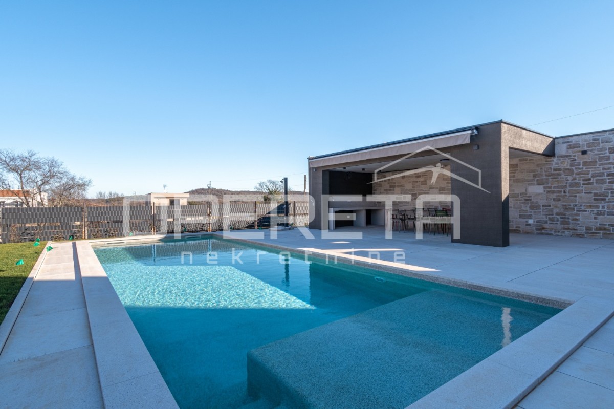 Bazen površine 48 m2 na principu solne elektrolize, vanjski tuš, ljetna natkrivena kuhinja površine 26 m2 osmišljena za druženja.