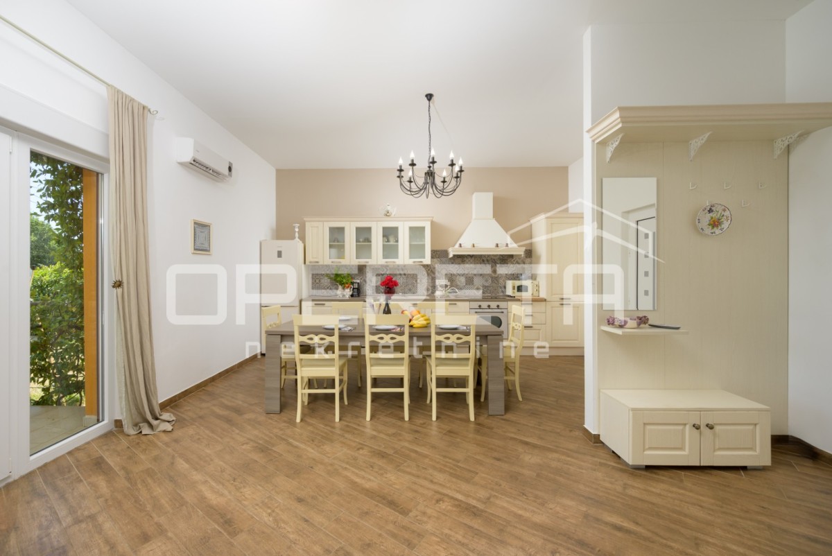 Cijeli objekt je klimatiziran, a dodatni luksuz pruža sauna — savršena za opuštanje u bilo koje doba godine. Iz dnevnog boravka i blagovaonice izlazi se na veliku natkrivenu terasu s ugrađenim kaminom, idealnu za zajednička druženja i večernja okupljanja. Uz terasu smješten je veliki bazen okružen ležaljkama, stvarajući savršenu zonu za sunčanje i odmor.