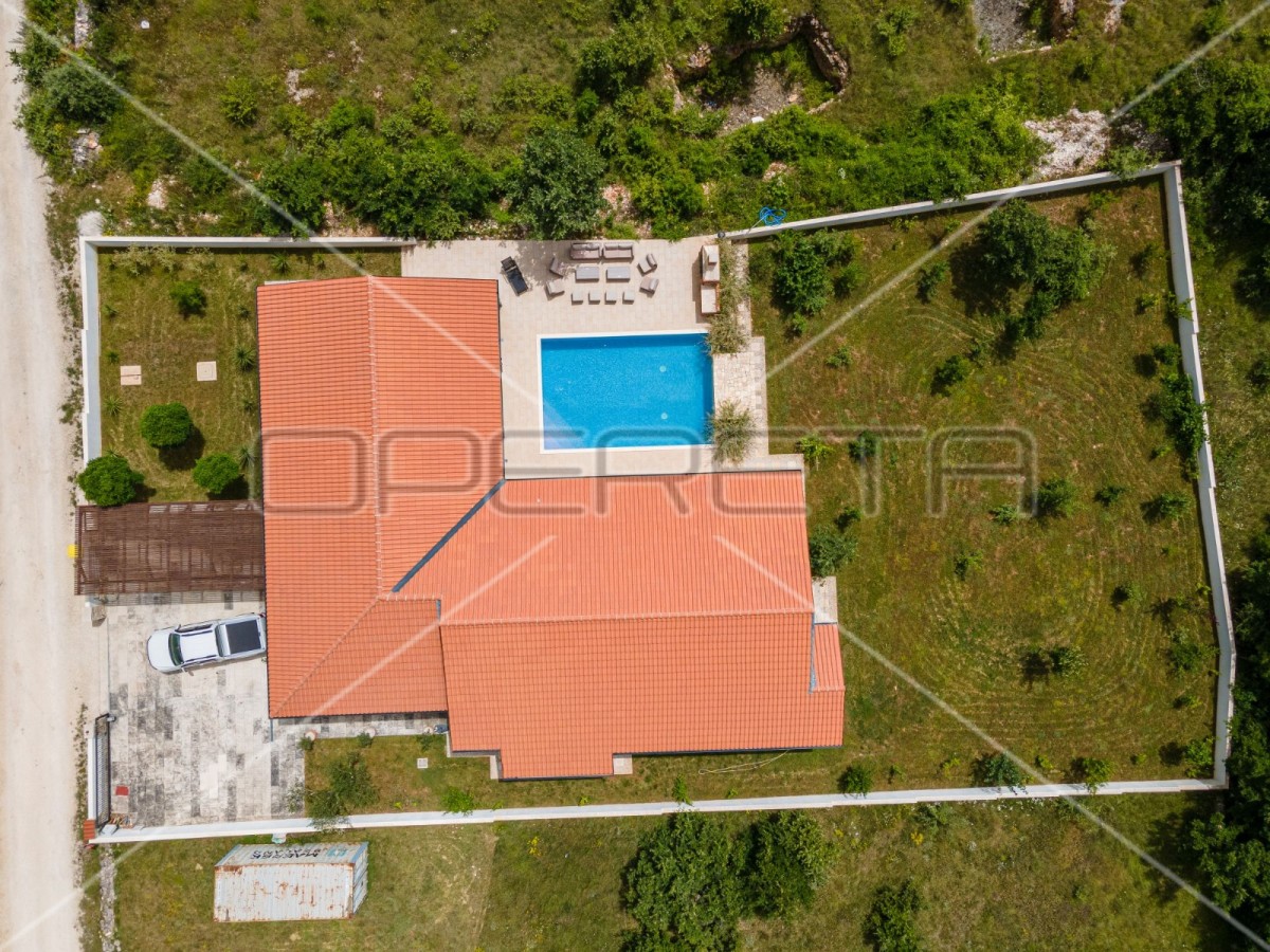 Vanjski dio čini bazen površine 42 m2 sa sunčalištem, kamin, prostran vrt s mediteranskim biljem i dovoljno zelenila koje upotpunjuje kompletan dojam.