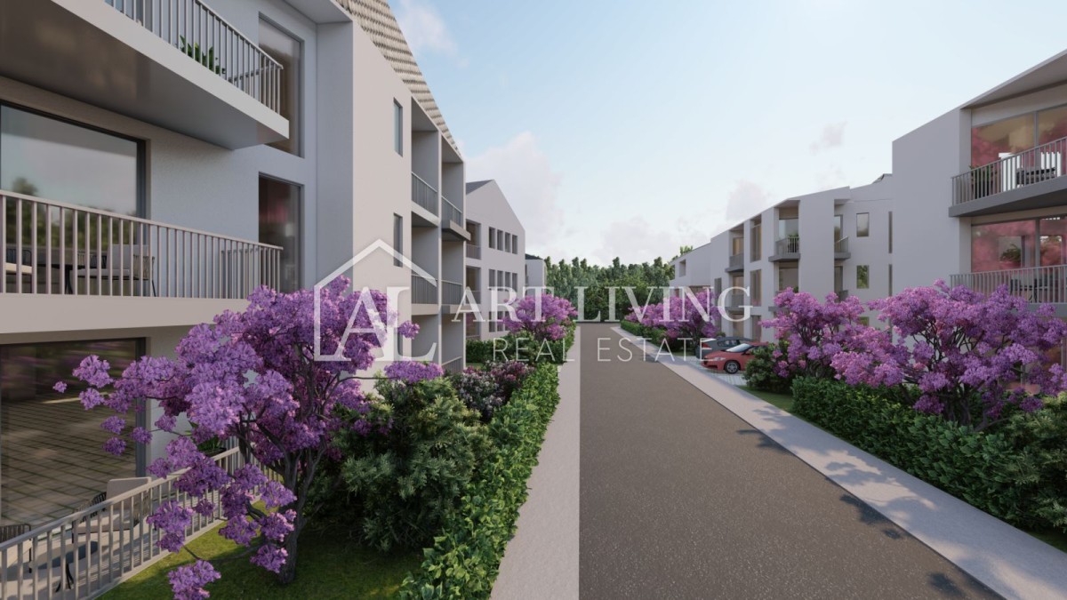 Stan u prizemlju sa vrtom ukupne površine 74,75 m2 sastoji se od hodnika, dnevnog boravka sa blagovaonicom i kuhinjom open space, 2 spavaće sobe sa vlastitim kupaonicama, ostave i natkrivene terase površine 8,59 m2.
