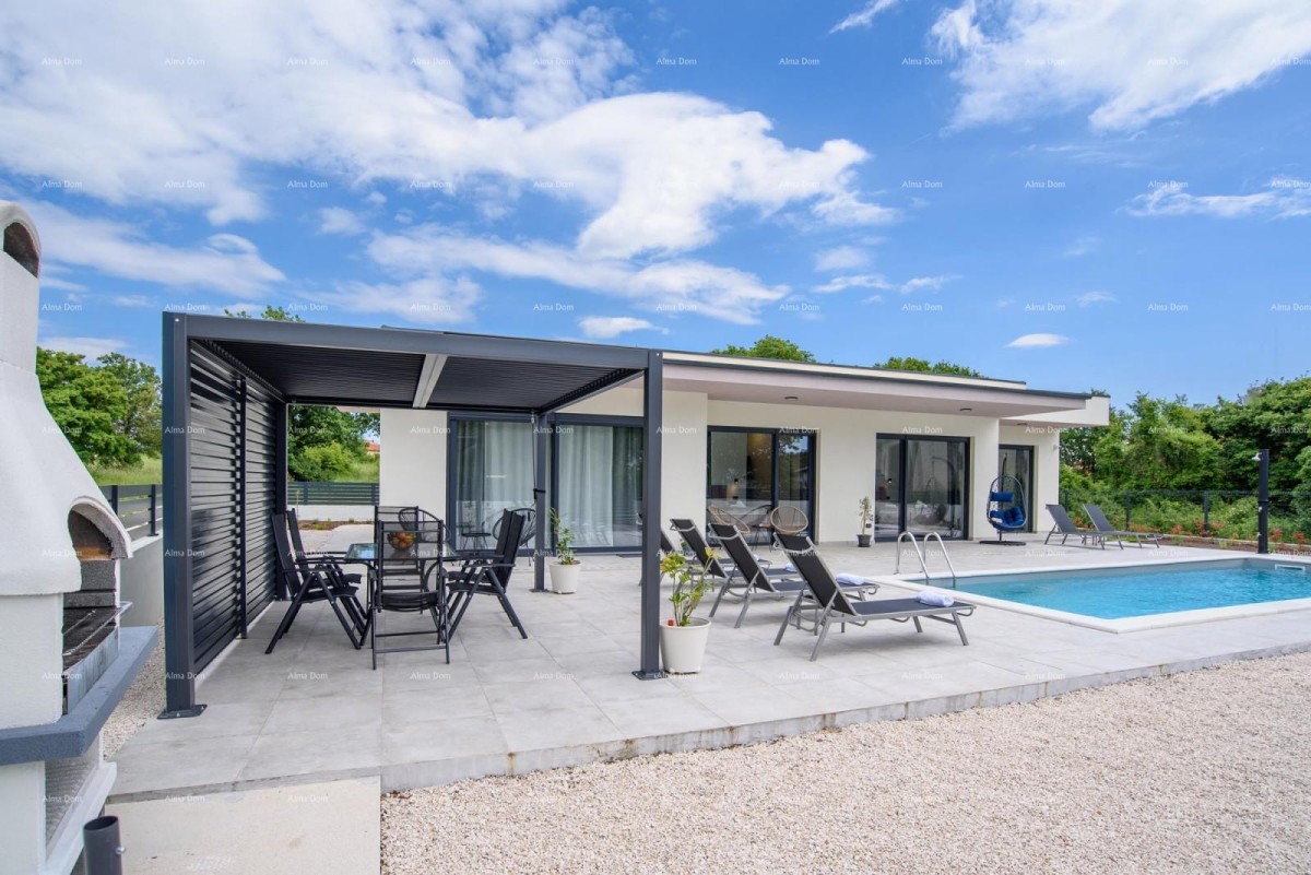 Na prodaju je moderna i elegantna vila prizemnica s bazenom, stambene površine 135 m², smještena na uređenoj i ograđenoj parceli od 614 m². Nekretnina je u potpunosti namještena, funkcionalna i odmah useljiva, a trenutno je uspješno uhodana za turistički najam.