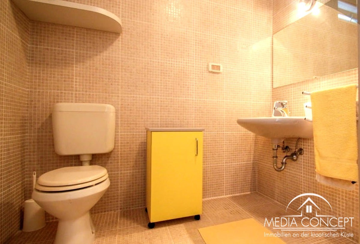 Ovdje Vam nudimo jednu prizemnicu na absolutno najboljoj lokaciji, naime, smještena je direktno na plaži! K 114 m2 netto stambene povšine smijemo slodobno dodati 16 m2 ostakljenu terasu, kao i dodatne prostorije (ložiona i spremište). Stambenu površinu sačinjavaju: kuhinja sa blagavaonicom i dnevnim boravkom, 3 spavaće sobe, 2 kupaonice sa WC-om. Sve prostorije Osim hodnika i kupatila imaju direktan prilaz na terasu, a sa time i pogled na more. Vanjski tuš. Austrijski prozori Actual, izvana Alu, unutra drvo-bijele boje. Fasada: 8 cm dalmatinski kamen (Obrovac) nefugiran. Grijanje: podno, zentralno i Klima. 4 parkirna mjesta.