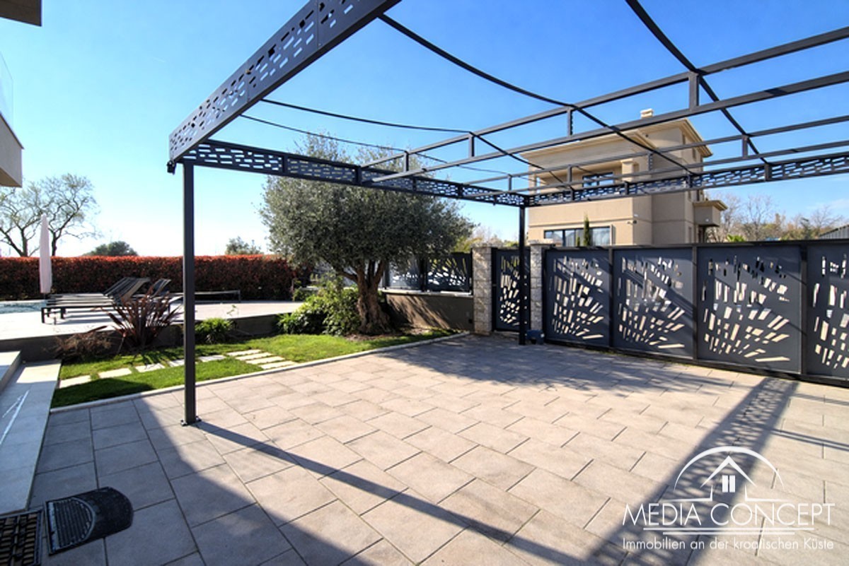 Vanjski prostor dizajniran je za maksimalno uživanje – bazen sa sunčalištem, natkrivena terasa za objedovanje na otvorenom te roštilj čine savršen ambijent za druženja i opuštanje.