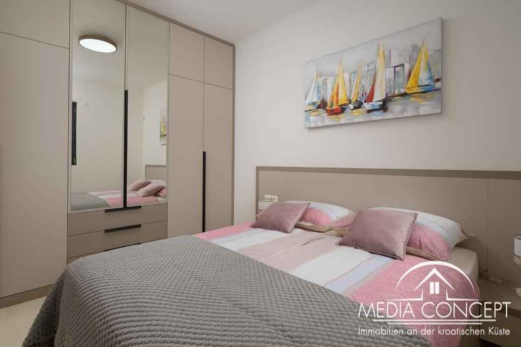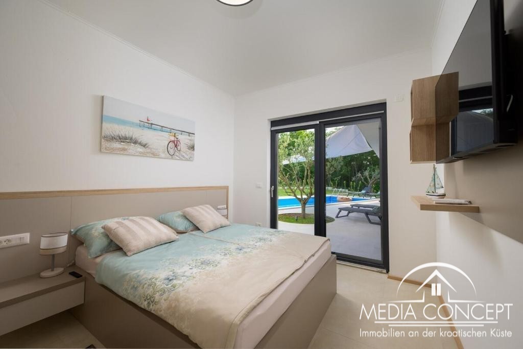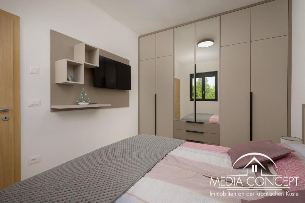 Spavaći trakt čine tri udobne i svijetle spavaće sobe te dvije moderno uređene kupaonice. Sobe su diskretno uvučene i pozicionirane kako bi osigurale maksimalnu privatnost i mir. Sve imaju izravan izlaz na bazen te prekrasan pogled na šumu i kultivirano dvorište. Opremljene su Daikin inverter klima uređajima koji omogućuju ugodnu temperaturu tijekom cijele godine, bilo da se radi o hladovini ljetnih dana ili toplini zimskih večeri.