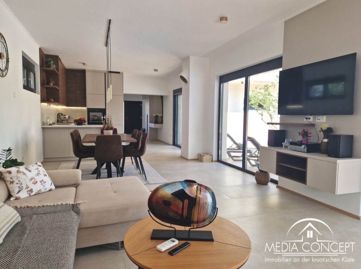 Dnevni prostor oduševljava svojom prostranošću i elegantnim open-space konceptom. Čine ga moderna kuhinja, blagovaonica i udoban dnevni boravak u kojem se nalazi kamin — idealan za stvaranje posebnog ugođaja u zimskim mjesecima. Velike staklene stijene protežu se gotovo duž cijelog prostora, unose obilje prirodnog svjetla i pružaju predivne poglede na vrt, bazen, šumu i okolne livade. Iz dnevnog prostora izlazi se na dvije terase: jedna je osmišljena kao idealan prostor za druženje sa BBQ, dok druga vodi prema sunčalištu i privatnom bazenu (31,5 m2 / 9 x 3,5 m) — savršeno mjesto za potpuno opuštanje.