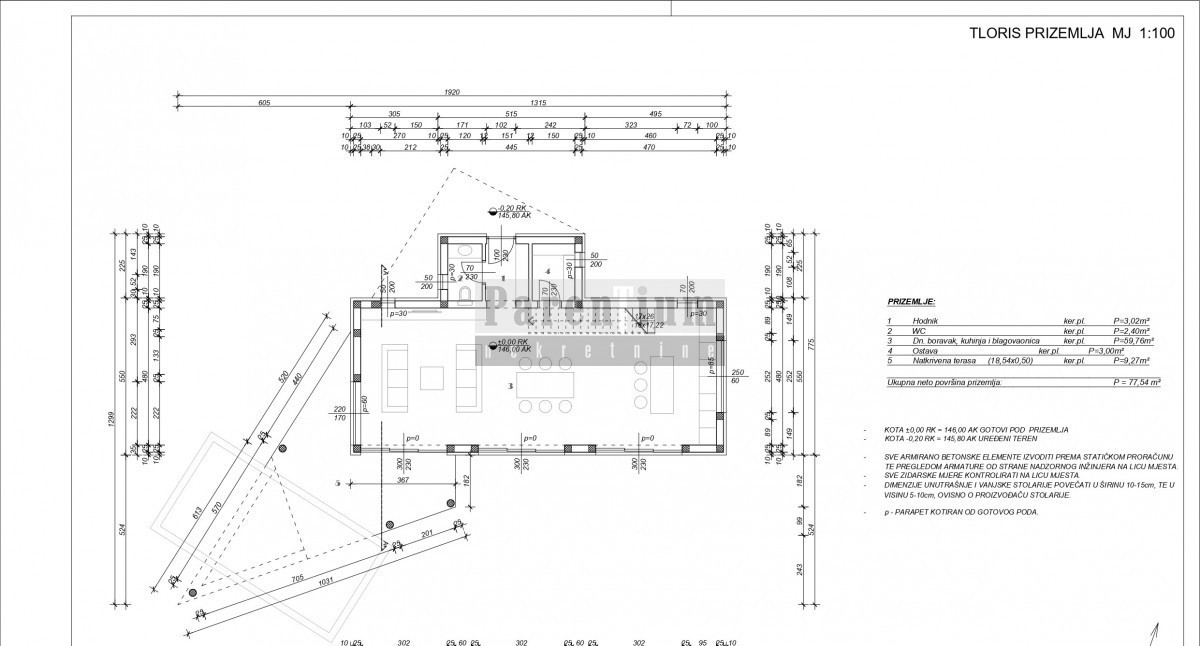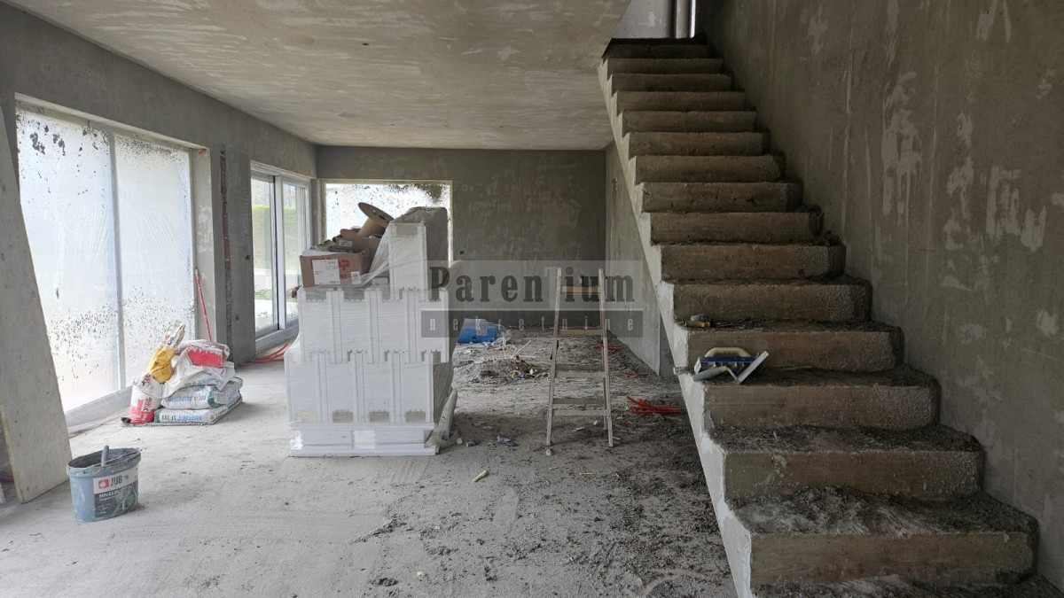 Kuća se proteže na dvije etaže, u prizemlju se nalazi veliki prostor od 77,54m2 gdje su smješteni dnevni boravak sa kuhinjom i blagovaona, te toalet i ostava.