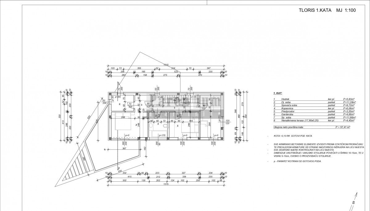 Na prvom katu na površini 58m2, nalaze se tri spavaće sobe, od kojih jedna ima vlastito kupatilo, garderobu i terasu, dok ostale dvije spavaće sobe imaju zajedničko kupatilo.