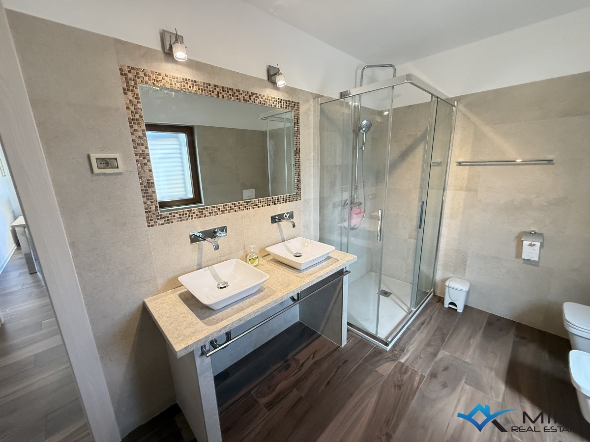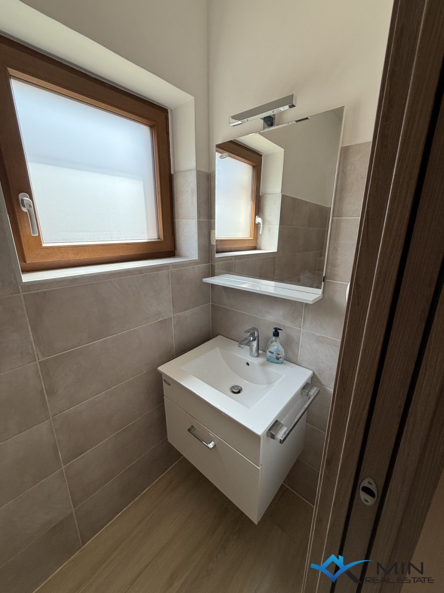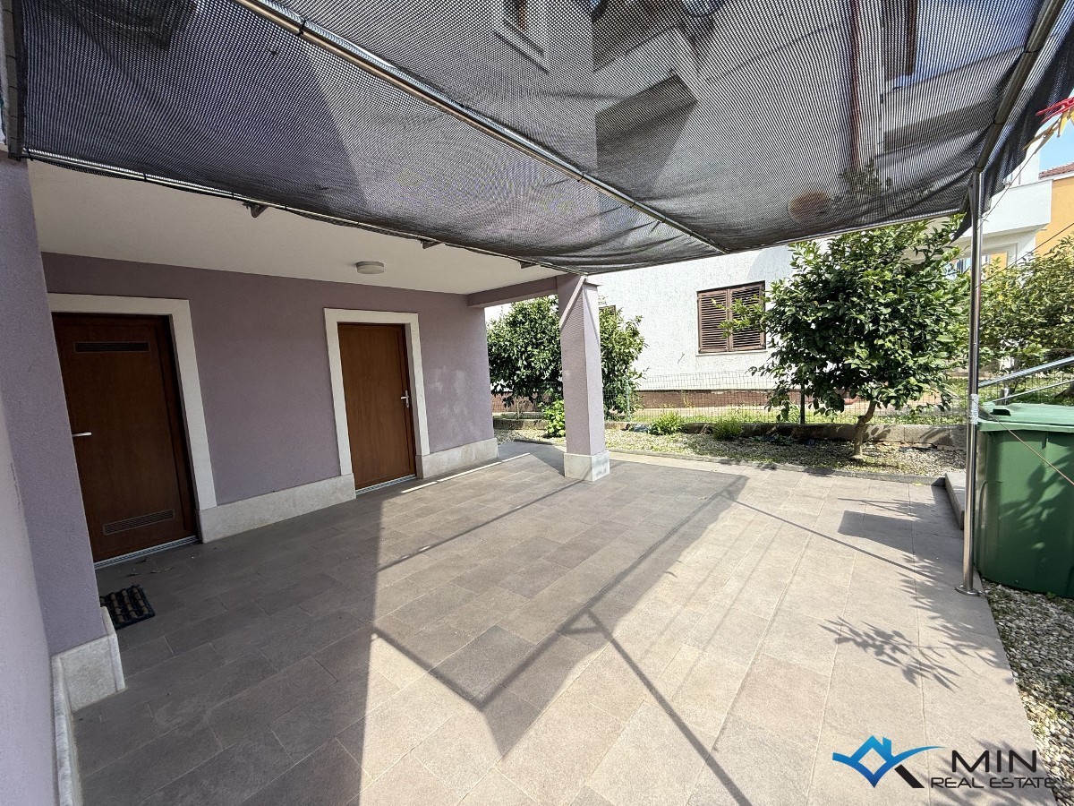 Prodaje se kuća na odličnoj lokaciji u centru grada, smještena u blizini svih sadržaja. Kuća se sastoji od 3 apartmana koji se nalaze u prizemlju i na 1. katu. Stan u prizemlju ima 71 m2 te ima poseban ulaz. Sastoji se od hodnika, wc-a, spavaće sobe sa privatnim kupatilom i izlazom na natkrivenu terasu te open space prostora u kojem se nalaze kuhinja s blagovaonicom i dnevni boravak s izlazom na natkrivenu terasu. Na 1. katu se nalaze 2 stana, koja se mogu koristiti odvojeno ili kao 1 veliki stan. Manji stan se koristi kao studio apartman i sastoji se od dnevnog boravka/ kuhinje i kupatila. Veći stan ima 74, 5 m2 i sastoji se od hodnika, kupatila, 2 spavaće sobe ( jedna spavaća soba ima izlaz na loggiu ) i open space prostora u kojem je smještena kuhinja s blagovaonicom i dnevni boravak. Kući pripada vrt od 368 m2 na kojem je moguće izgraditi bazen. Kuća ima 5 parkirnih mjesta od kojih je 4 natkriveno.