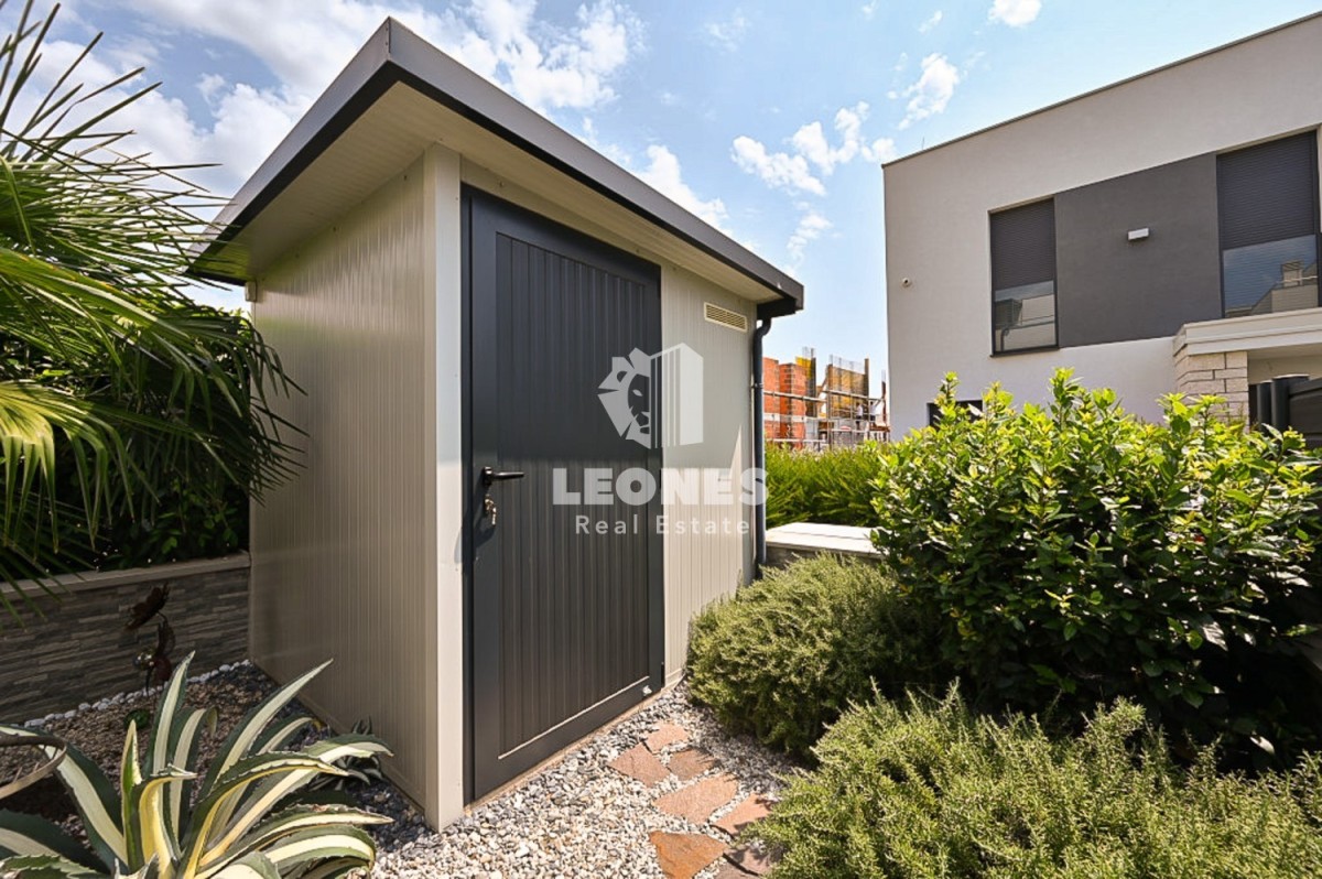 Kuća se prodaje kompletno opremljena, ima svoju vrtnu kućicu, vanjsko spremište za bicikle i parkirno mjesto.