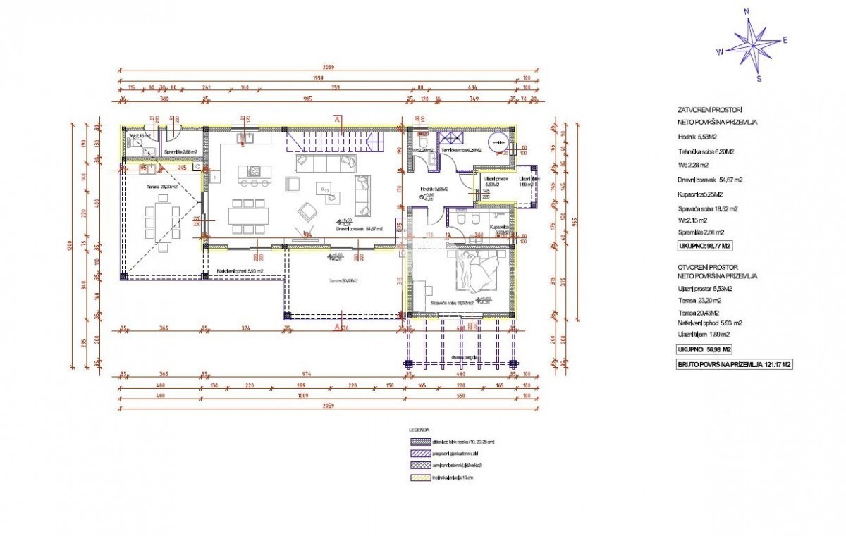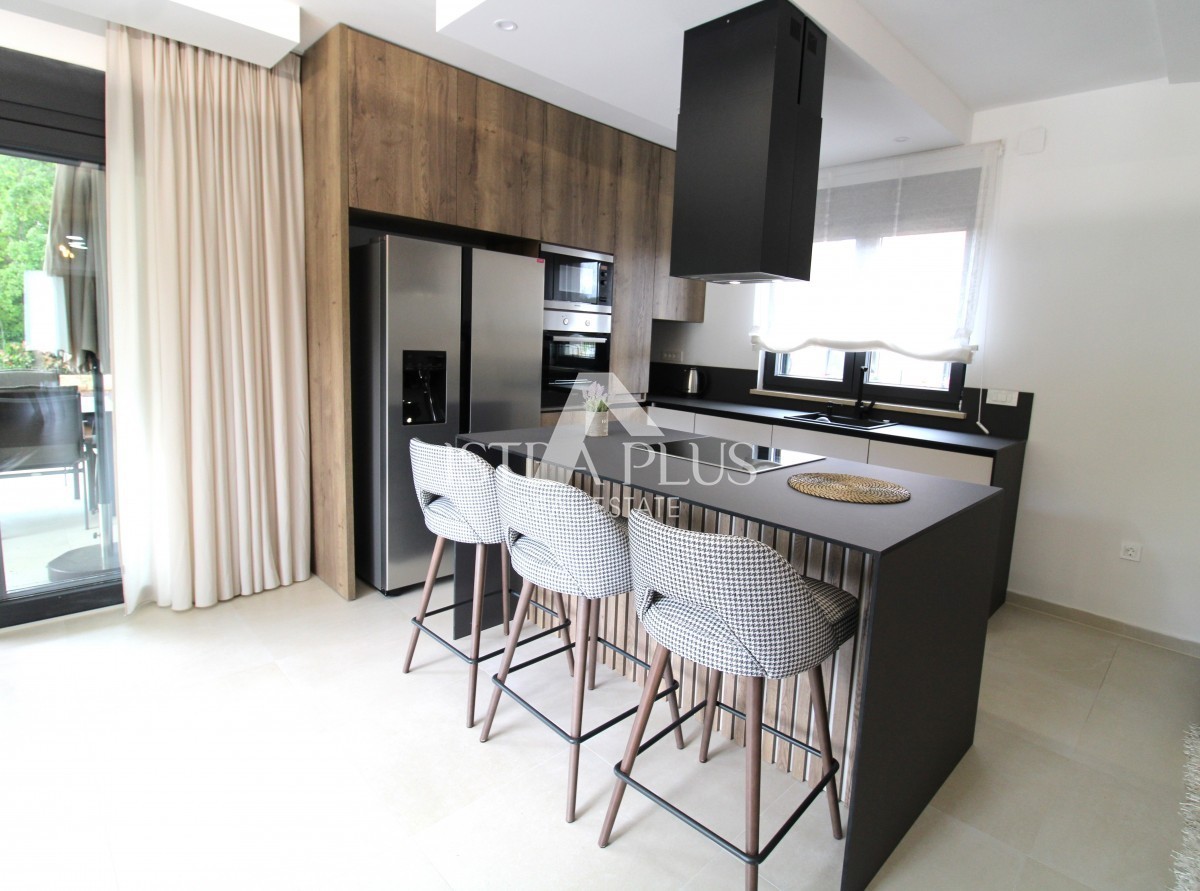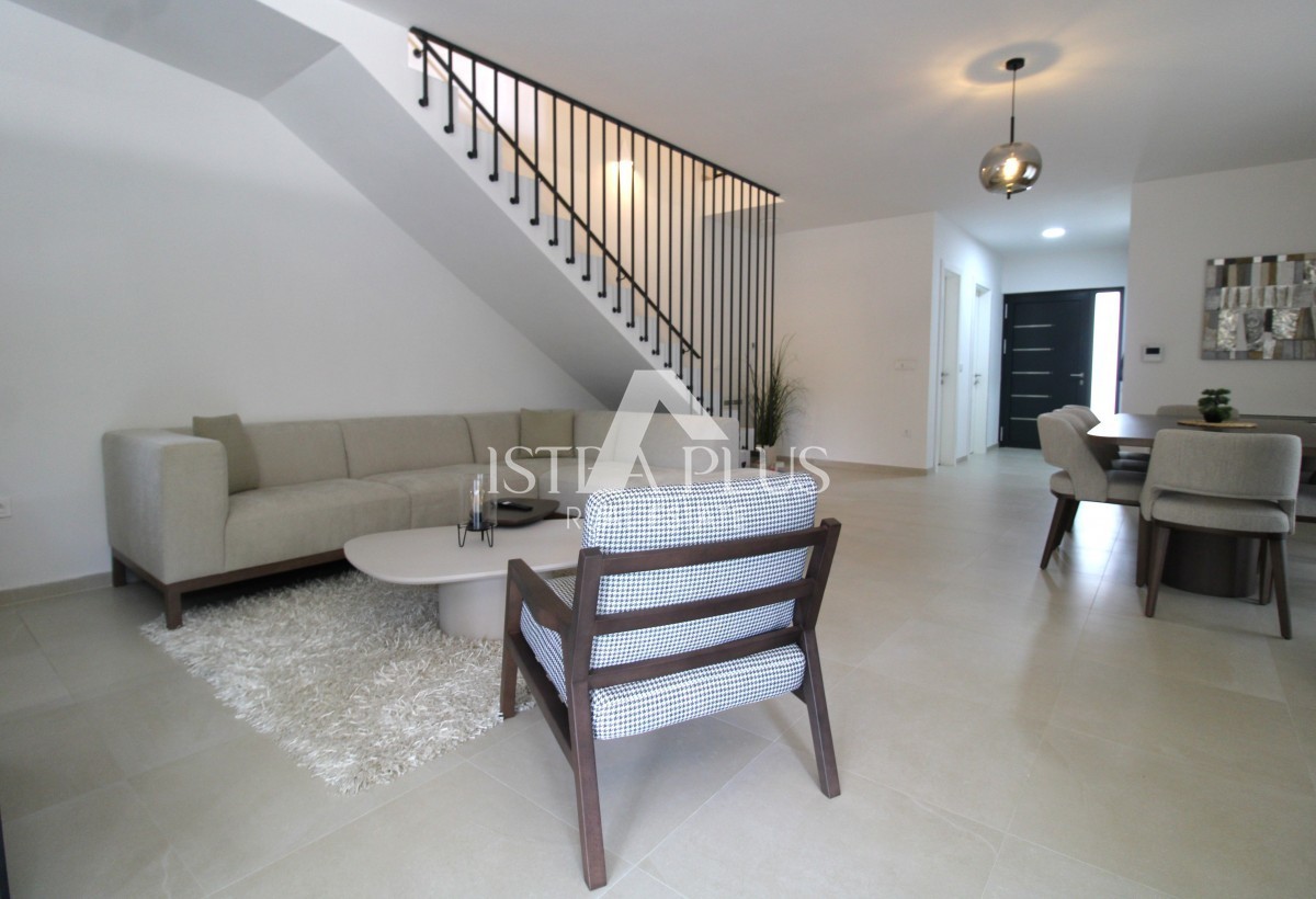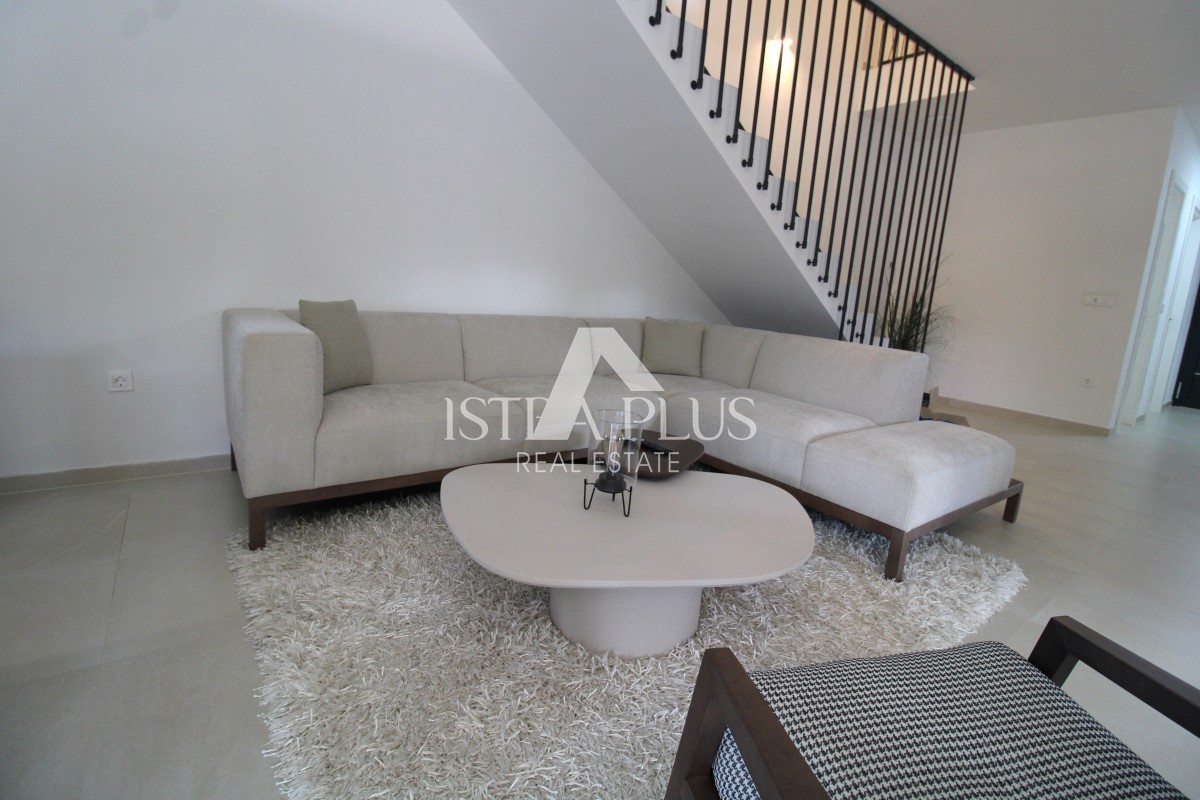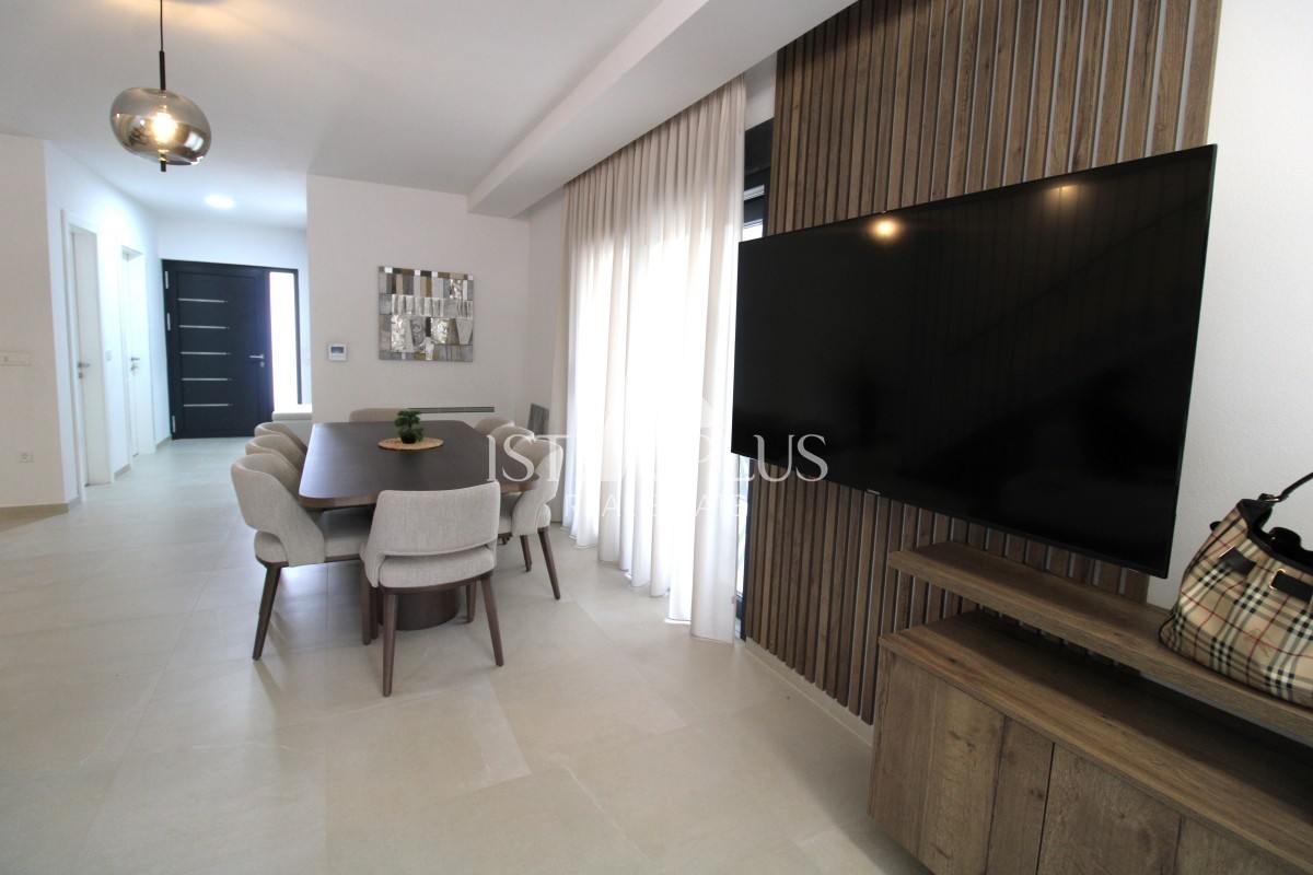 U prizemlju se nalazi ulazni hodnik, kotlovnica sa vešerajem, gostinjski WC, jedna spavaća soba sa vlastitom kupaonom i vlastitim izlazom u dvorište, veliki dnevni boravak, blagovaonica i kuhinja po open space konceptu sa izlazom na natkrivenu terasu, gdje se nalazi ljetna kuhinja sa kaminom, prostrano sunčalište te bazen 11m x 4.5m. Uz bazen se nalazi vanjski tuš, te vanjski WC i još jedno spremište.