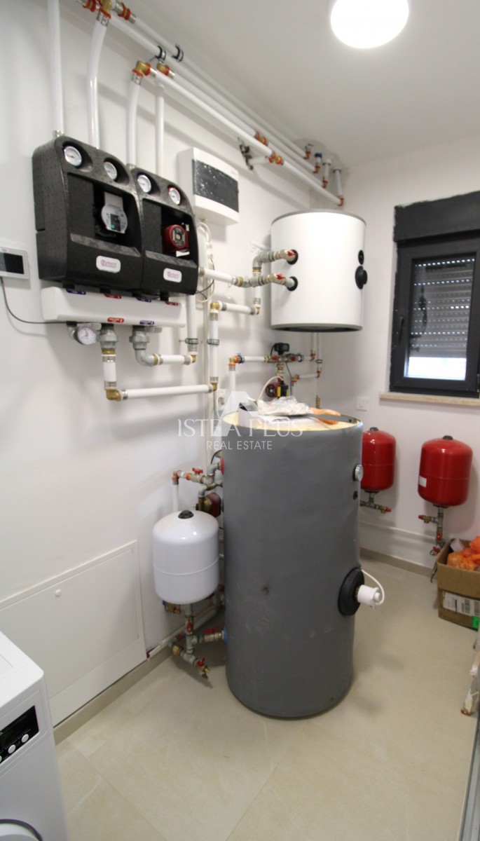 Vila ima toplinsku dizalicu 16KW, sa mogućnosti paljenja na daljinu, podno grijanje, te fenkojleri u svim prostorijama.