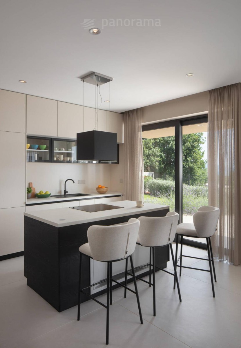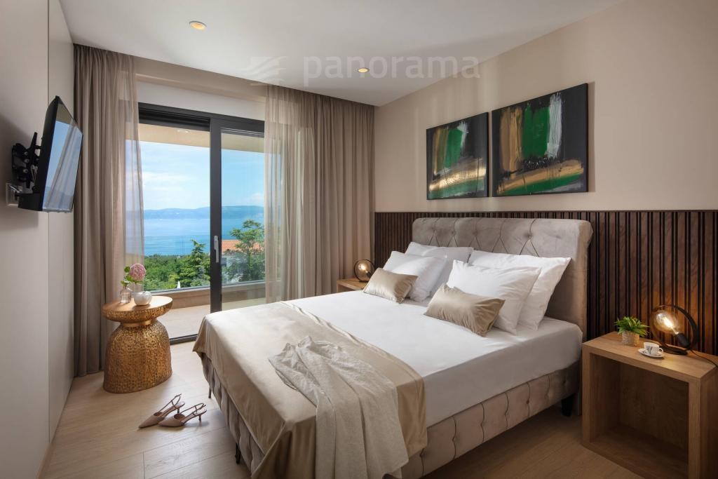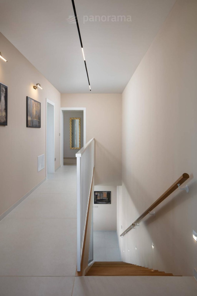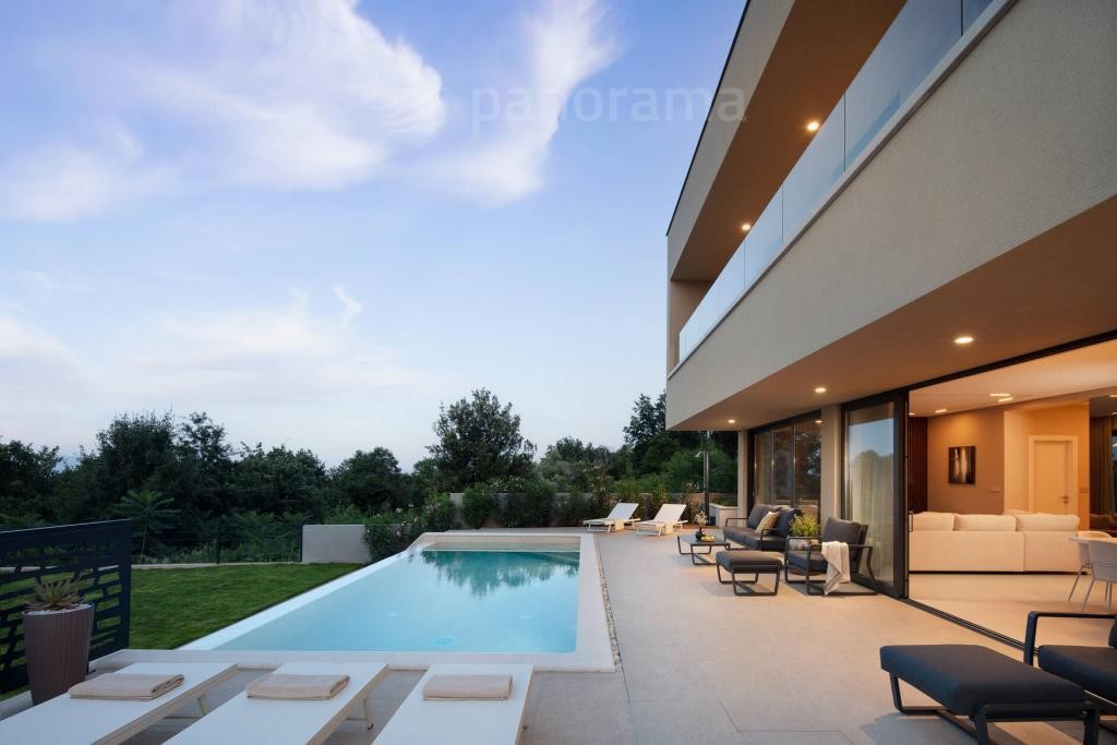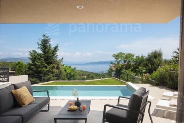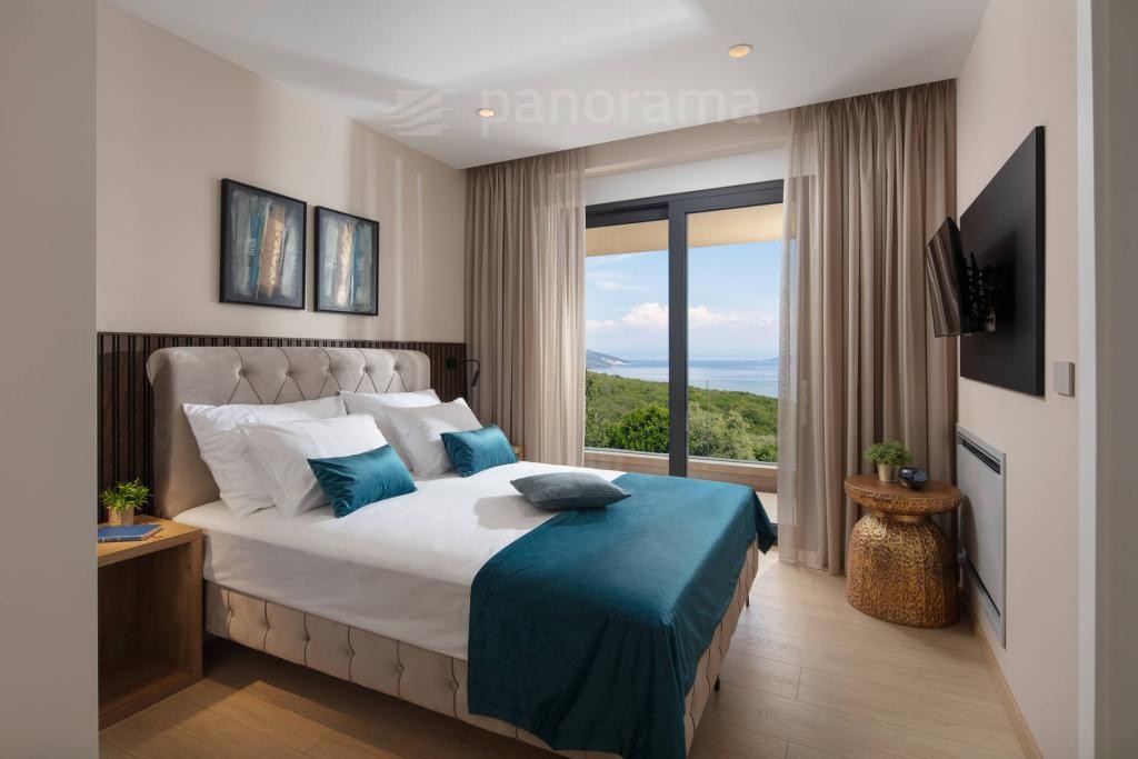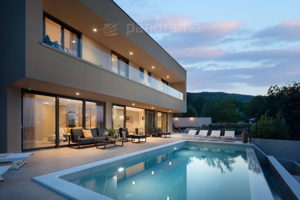 Vila je površine 200 m2 i prostire se na dvije etaže. U prizemlju su kuhinja, blagovaona i dnevni boravak open space koncepta, te ostava, praona, garderoba i wc. Unutarnjim konzolnim stubištem dolazi se na kat gdje se nalaze 3 spavaće sobe, svaka sa svojom kupaonom i izlazom na terasu s koje se pruža neponovljiv, panoramski pogled na Kvarner, otoke Cres, Lošinj i grad Rijeku.
