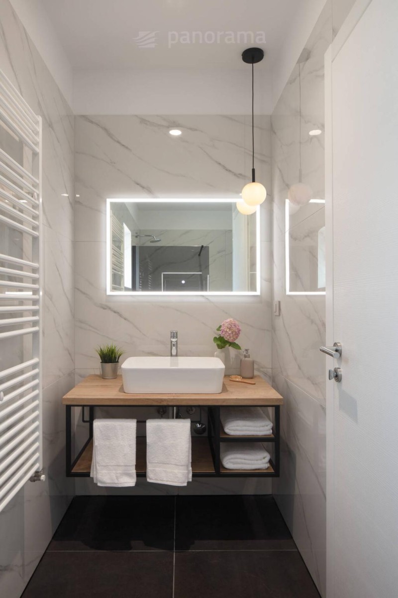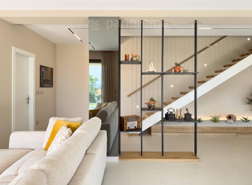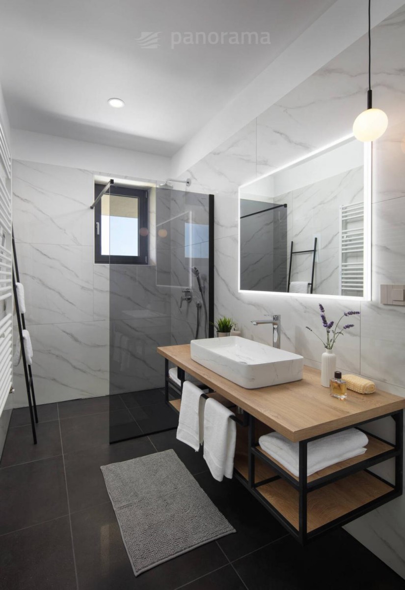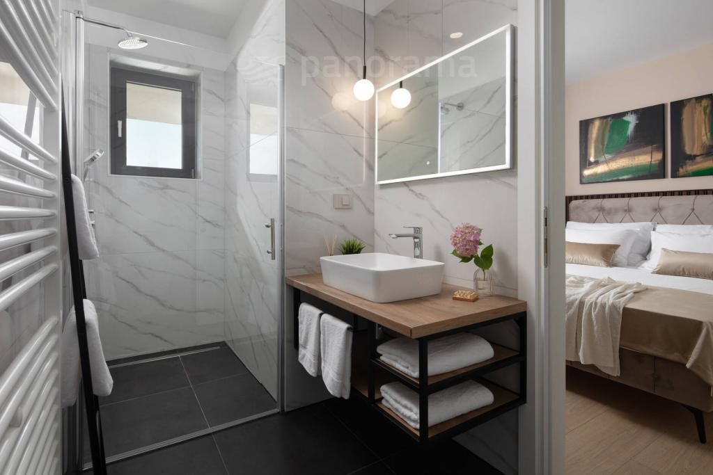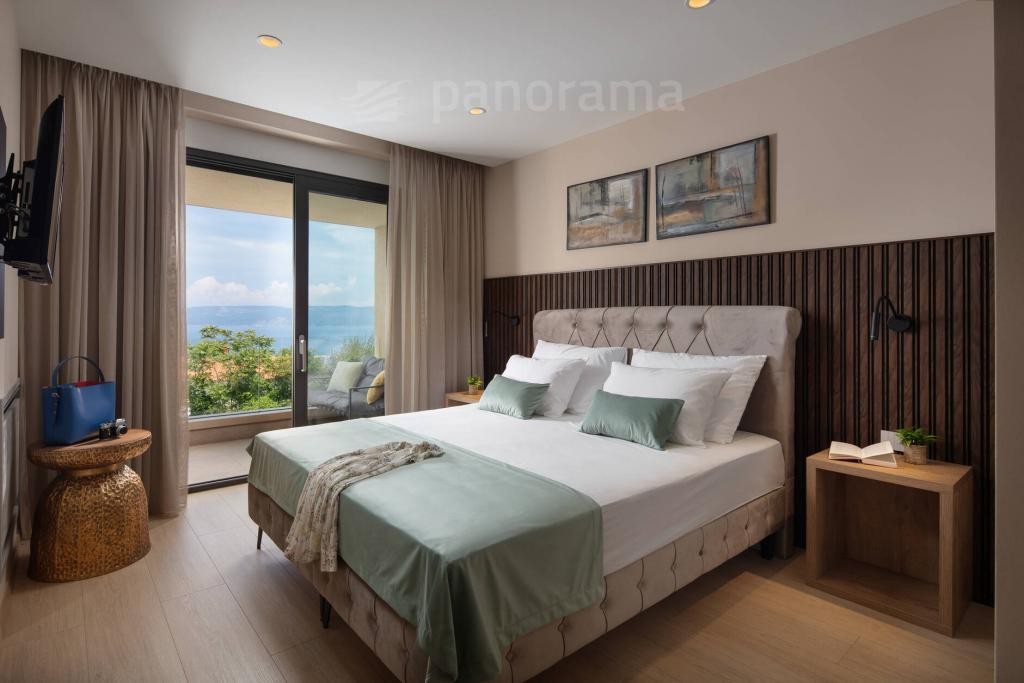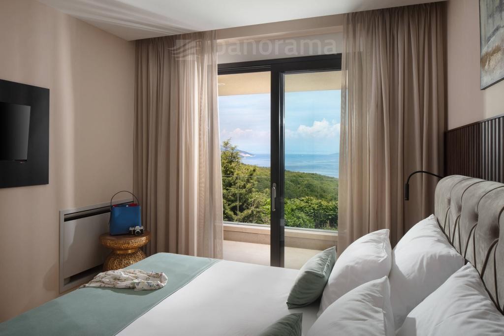 Vila je površine 200 m2 i prostire se na dvije etaže. U prizemlju su kuhinja, blagovaona i dnevni boravak open space koncepta, te ostava, praona, garderoba i wc. Unutarnjim konzolnim stubištem dolazi se na kat gdje se nalaze 3 spavaće sobe, svaka sa svojom kupaonom i izlazom na terasu s koje se pruža neponovljiv, panoramski pogled na Kvarner, otoke Cres, Lošinj i grad Rijeku.