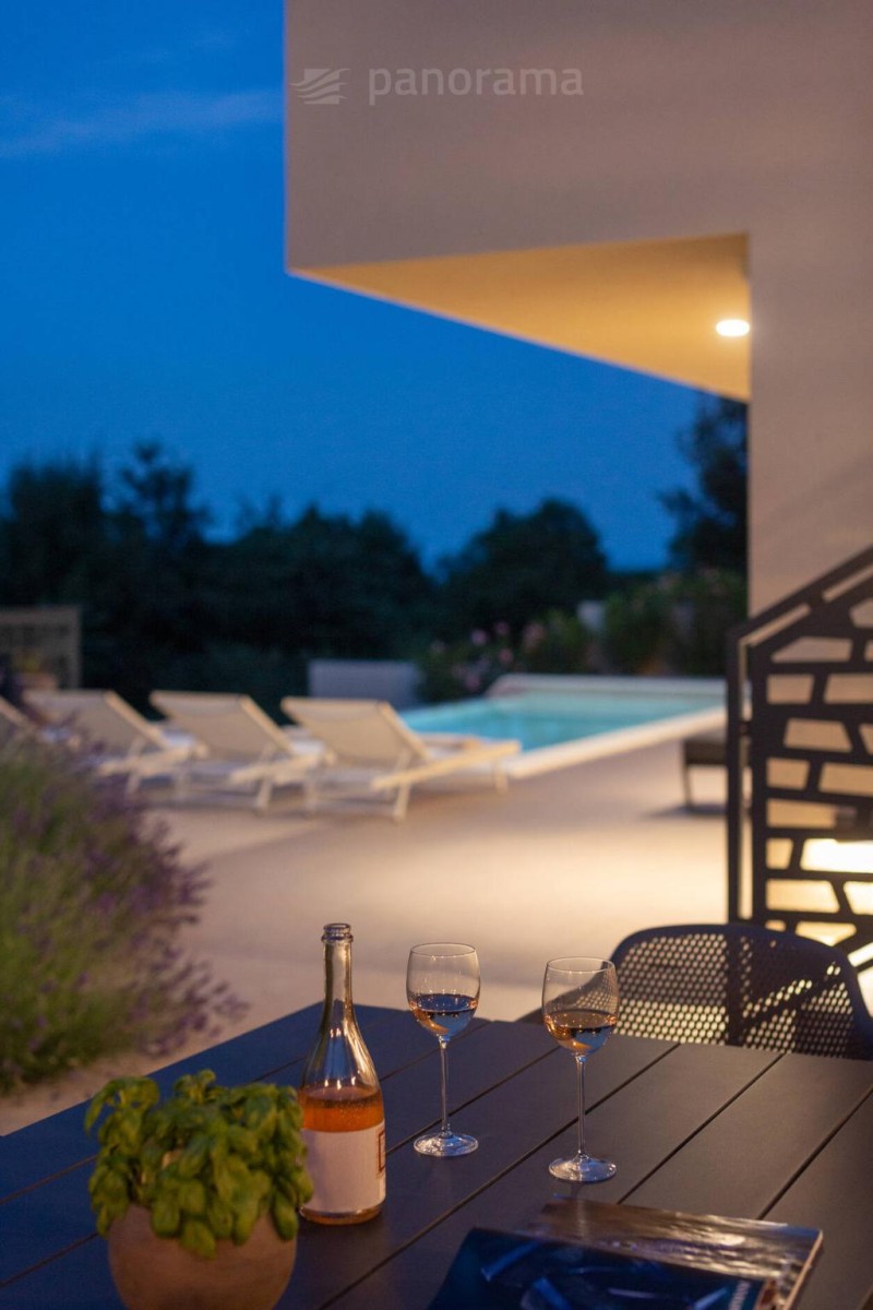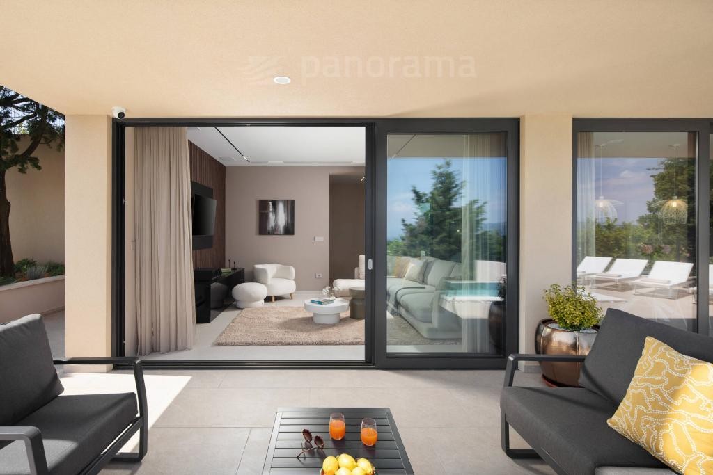 Otvaranjem staklenih stijena u dnevnom boravku, dolazi se na terasu s vanjskim dnevnim boravkom, ljetnom kuhinjom i kaminom, sunčalištem i preljevnim bazenom.