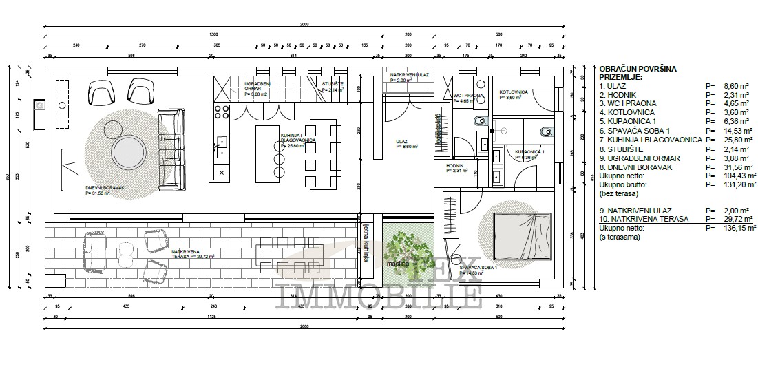Prizemlje vas dočekuje elegantnim ulaznim hodnikom koji vodi u prostrani dnevni boravak, opremljen kuhinjom i blagovaonicom. Dodatno, prizemlje nudi praktične prostore kao što su kotlovnica, praonica rublja, spavaća soba s vlastitom kupaonicom, dodatni gostinjski toalet i pozivajuću natkrivenu terasu od otprilike 30 četvornih metara s ljetnom kuhinjom.