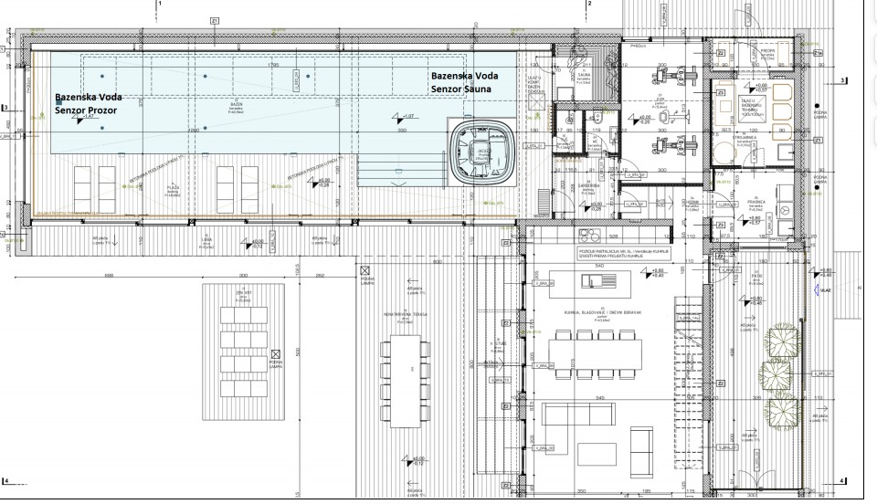 Velika terasa nudi miran kutak za opuštanje, dok se prozori otvaraju prema prekrasnom vrtu i unutarnjem/vanjskom grijanom bazenu 18m dužine, 3.5m širine. Veličanstven pogled na okolnu prirodu pruža osjećaj unutarnje ravnoteže i spokoja.