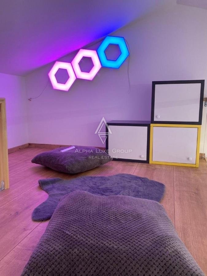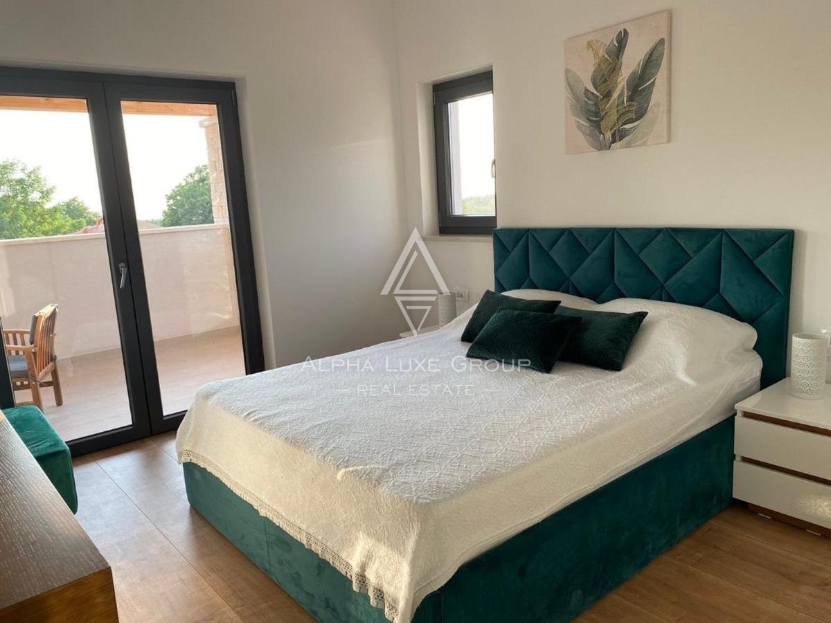 Unutarnje stepenice vode na kat gdje se nalaze tri spavaće sobe, dvije kupaonice i prostrana terasa s koje se pruža panoramski pogled na zelenilo i more.
