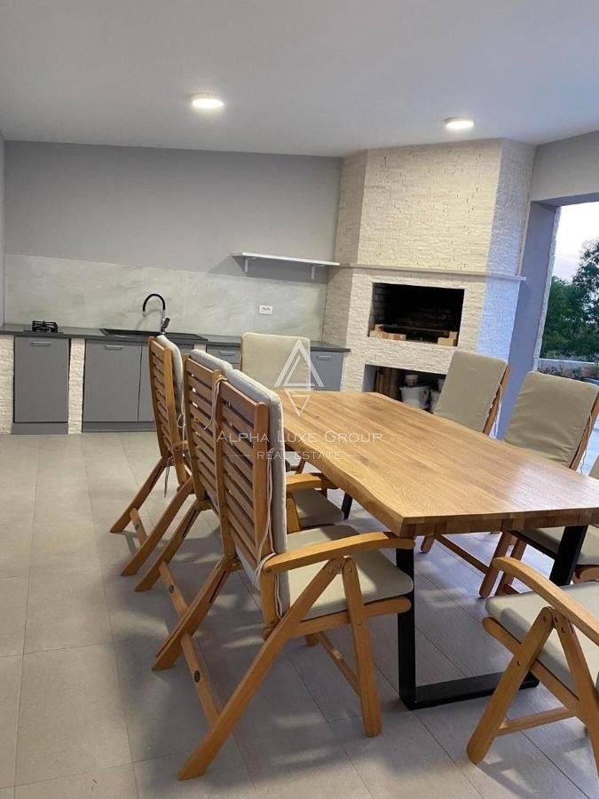 Okućnica je lijepo uređena i ima popločene staze, automatsko navodnjavanje i vanjsku rasvjetu. Na njoj se nalazi grijani bazen sa slanom vodom površine 36m2, ljetna kuhinja s ostavom i dječje igralište.