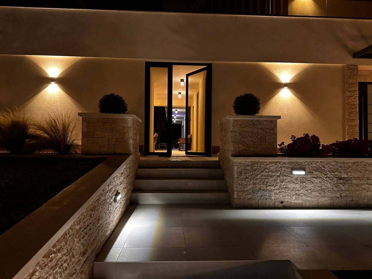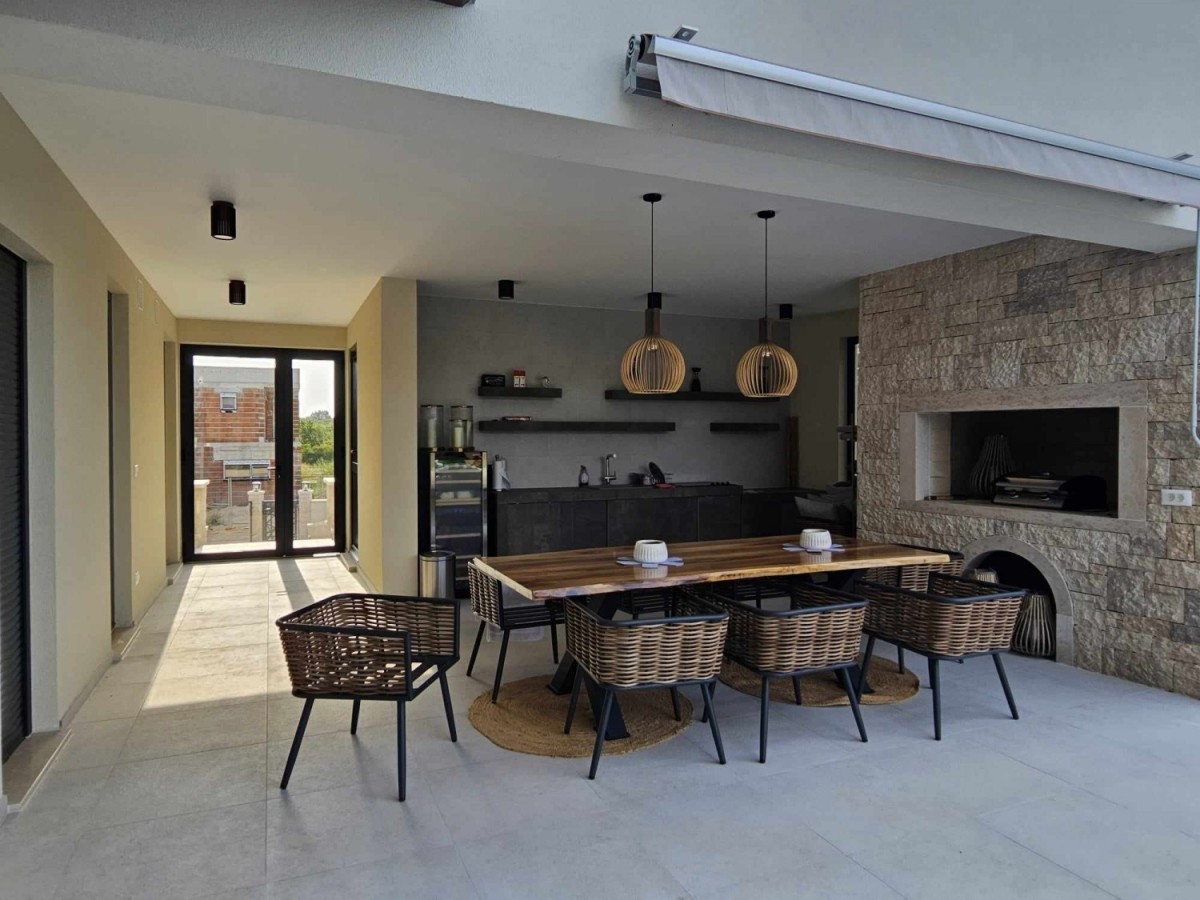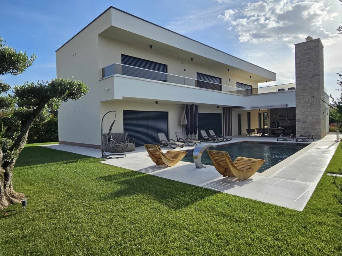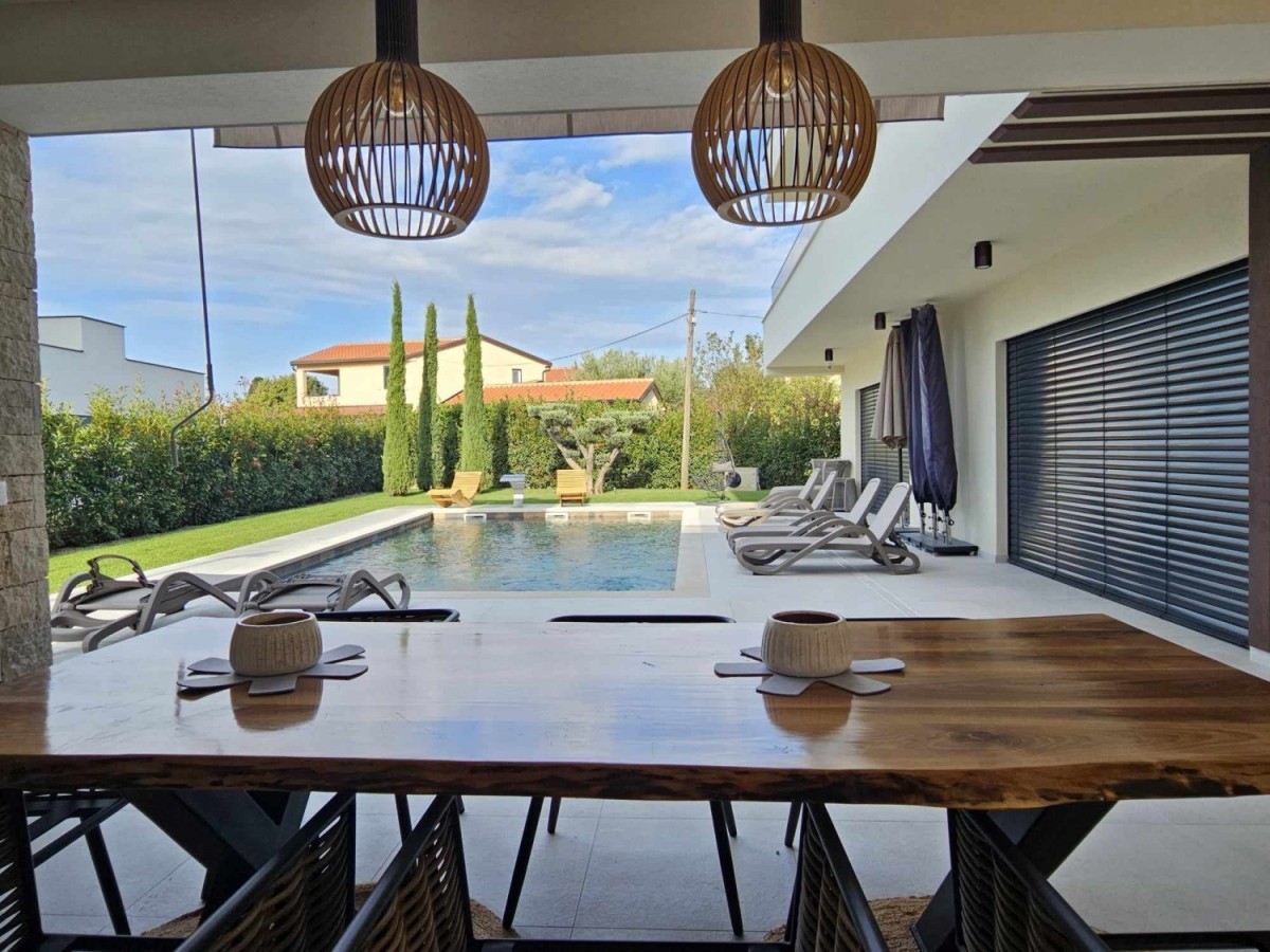 POREČ- luksuzna vila na mirnoj lokaciji, ca 2 km od Poreča i mora- Vila ima 360 m2 bruto površine- sastoji se od dnevnog boravka sa kuhinjom i blagovaonom, 4 spavaće sobe, 5 kupatila, wc za goste, ljetne kuhinje i prostrane terase sa pogledom na more- kuća se prodaje kompletno namještena i opremljena- uređena okućnica sa automatskim navodnjavanjem i grijanim bazenom sa slanom vodom od 45 m2- aluminijska stolarija- alarm i video nadzor- grijanje: podno grijanje, dizalica topline.