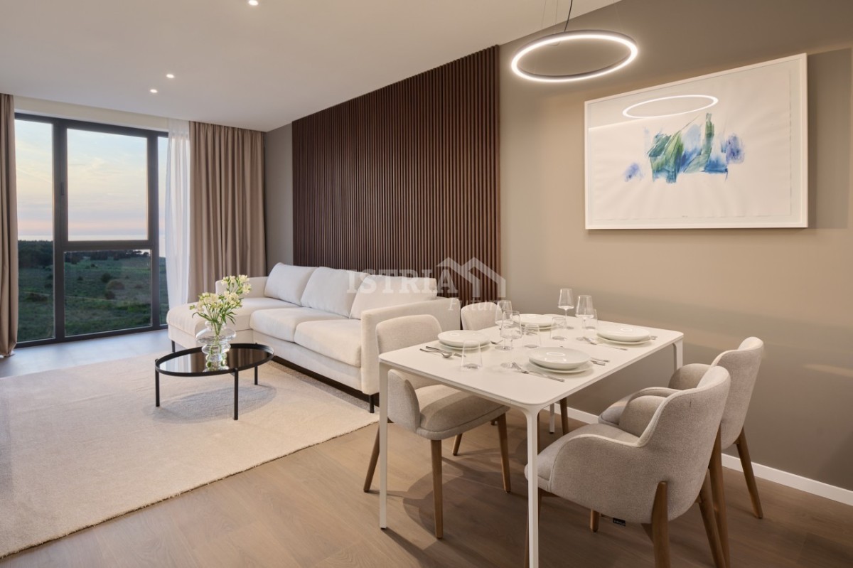 Na prodaju predivan, luksuzni, potpuno namješten i opremljen stan prilagođen osobama s invaliditetom površine 61,50 m2 sa pogledom na uređeni park i bazen smješten u atraktivnom resortu.