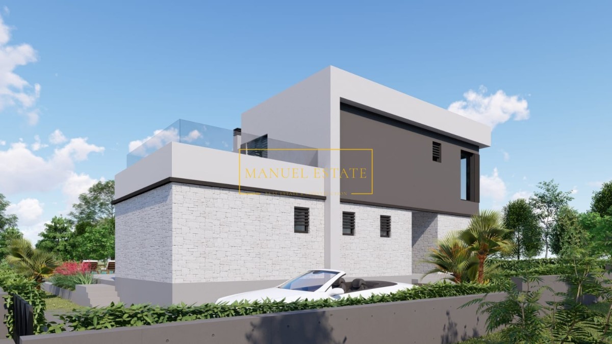 Prizemlje vile sadrži ulazni hodnik koji vodi do prostranog dnevnog boravka, te kuhinje i blagovaonice u otvorenom planu. Ovaj prostor je idealan za druženja i obiteljske trenutke, pružajući obilje prirodnog svjetla i osjećaj prostranosti. Na ovoj etaži također se nalazi jedna spavaća soba s vlastitom kupaonicom, dodatni WC te ostava, što osigurava praktičnost i funkcionalnost u svakodnevnom životu. Iz dnevnog boravka izlazi se na natkrivenu terasu s ljetnom kuhinjom, savršenu za uživanje u toplim večerima i druženjima na otvorenom. Terasa vodi do uređene okućnice s preljevnim bazenom, pružajući luksuz i opuštanje u privatnosti vlastitog dvorišta.