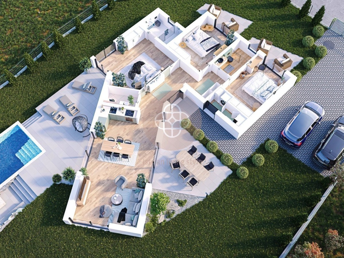 Također će biti 3 spavaće sobe na jednoj etaži, od kojih jedna ima vlastitu kupaonicu. Još dvije spavaće sobe dijele još jednu kupaonicu. Obje kupaonice opremljene su tuš kabinom, umivaonikom, WC-om i osvijetljenim ogledalom. Sve tri spavaće sobe imaju slobodan pristup vrtu kroz dvorišna vrata i na prostrane terase. Na vanjskom prostoru iznad vratiju, postavljena je rasvjeta. Cijeli dnevni dio uređen je visokokvalitetnim laminatom a sanitarni prostori visokokvalitetnom keramikom. U gostinjskom wc-u predviđen je priključak za perilicu rublja. Dnevni boravak vodi do prostrane stražnje terase na koju se nadovezuje područje bazena. Bazen 22m2, s odličnom talijanskom keramikom, rimskim stepenicama, rasvjetom i najnovijim bazenskom tehnologijom omogućit će vam bezbrižne sate. U ovom trenutku možete slobodno odabrati hoćete li koristiti klor ili nisku razinu njege. Uz doplatu može se ugraditi sustav soli. Naravno tu je, na zahtjev, izvediv i grijač za bazen.