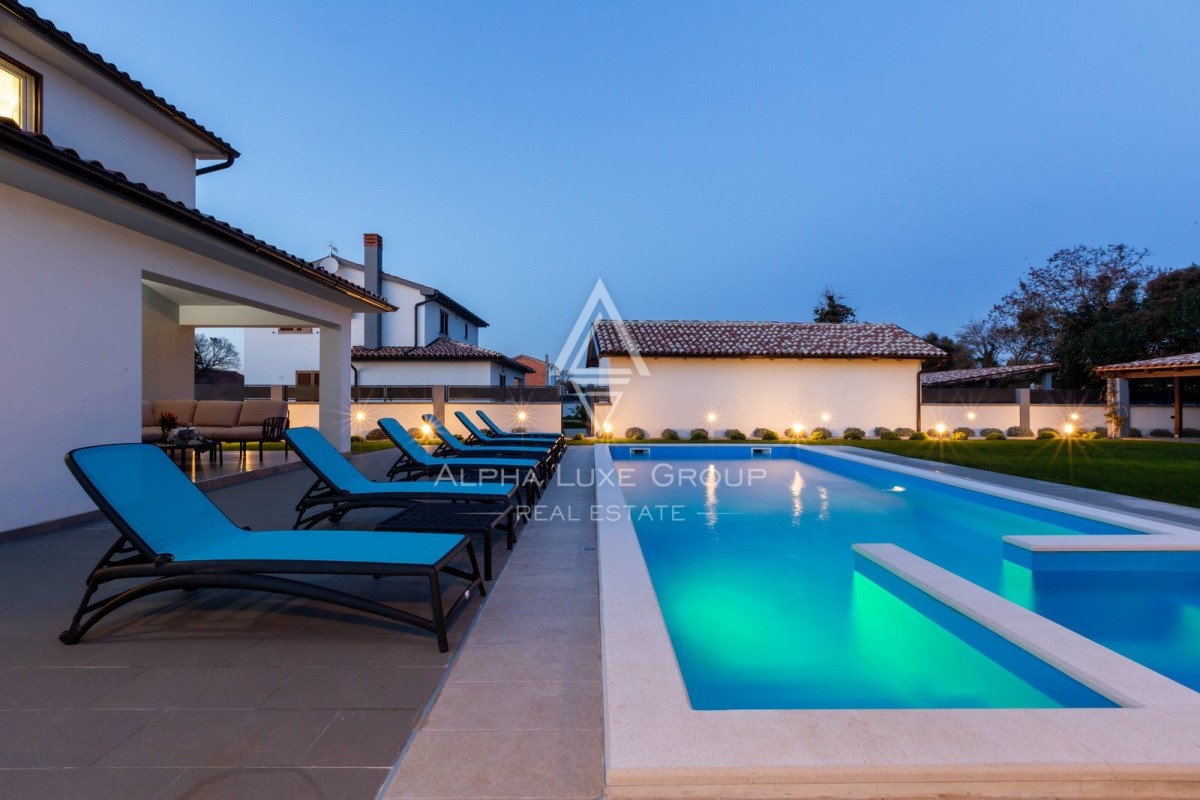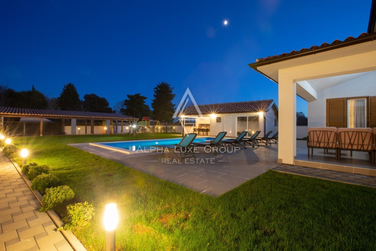 Tu je i sunčalište, dječji park, uređena zelena površina, natkriveno privatno parkiralište, te pomoćni objekt i bazen. Kuća je u potpunosti opremljena vrhunskim materijalima i suvremenim značajkama, a projektirana je i podignuta nedavno.