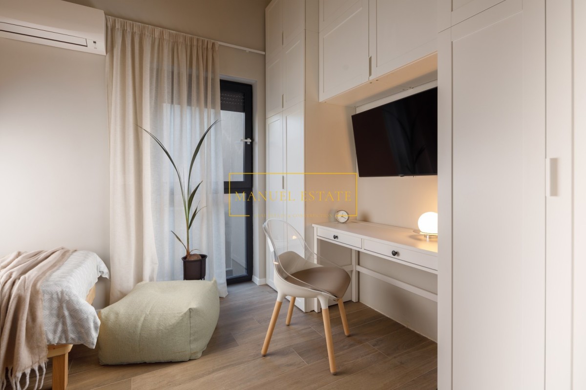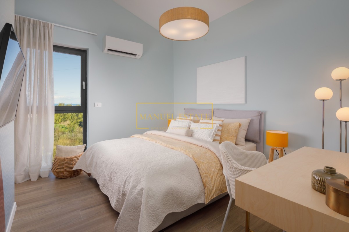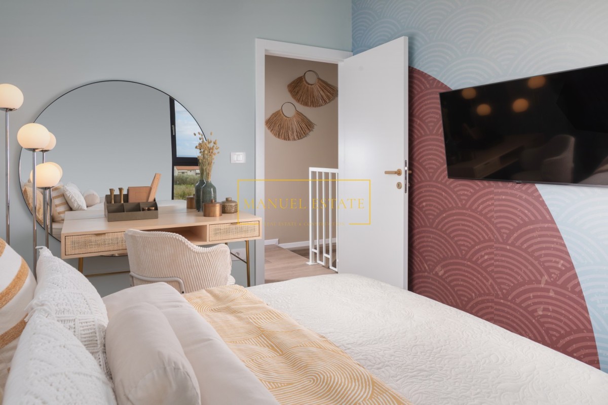 Moderna kuća u nizu (B3), u blizini Poreča, sveukupne stambene površine 77.54 m2. Prostire se na dvije etaže, prizemlje i kat. U prizemlju se nalazi kuhinja + blagovaonica s izlazom u vrt, toalet, stubište i spremište, te dnevni boravak s izlazom na terasu i vrt. Na drugoj etaži nalazi se: stubište, hodnik, dvije spavaće sobe, kupaonica i galerija. Grijanje i hlađenje prostorija se vrši pomoću vrhunskih klima uređaja. Vanjski dio čini pomno uređena okućnica 83.03 m2. U dvorištu se nalazi jedno parking mjesto. Rezidencijalni kompleks od sveukupno 10 kuća u nizu nalazi se u blizini mora, i svega 4.7 km od povijesnog centra grada Poreča. Cijena ove kuće u nizu modernog dizajna iznosi 360.000 eura (PDV i agencijska provizija uključeni u cijenu). Potpuno opremljena namještajem i opremom za iznajmljivanje, uz kategorizaciju za pružanje usluga turističkog smještaja. Za sve ostale informacije slobodno nas kontaktirajte.