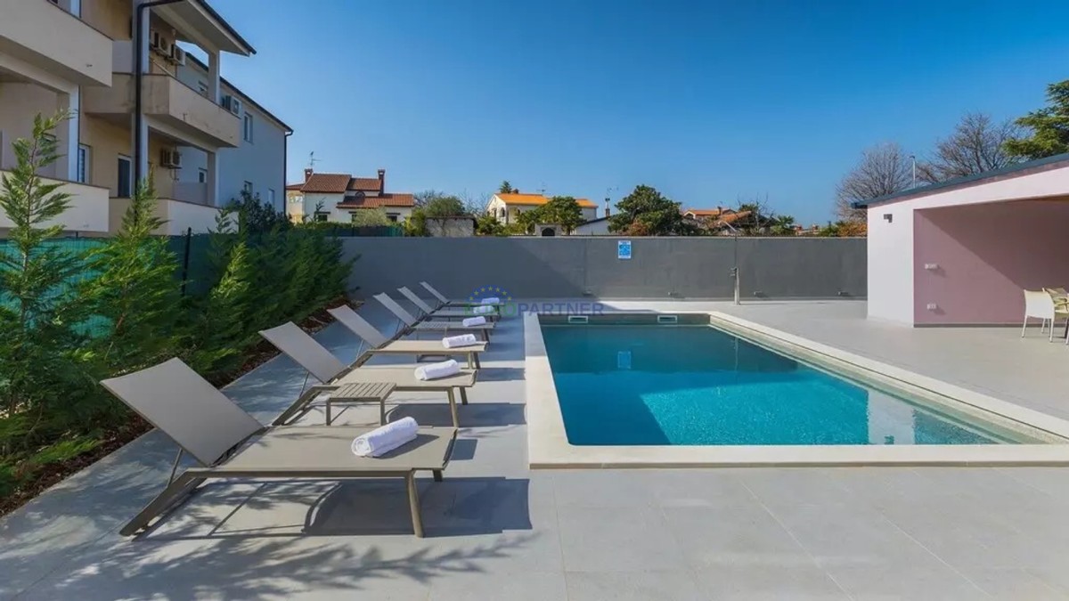 U dvorištu nalazi se bazen 32m2 obložen kulirom i opremljen sustavom grijanja za bazene. Pokraj bazena nalazi se ljetna kuhinja sa stolom za objedovanje i vanjskim WC-om.