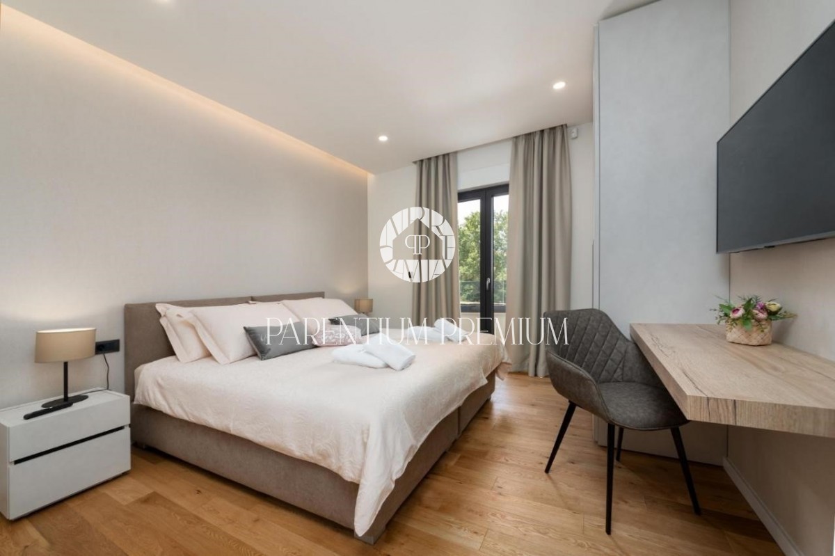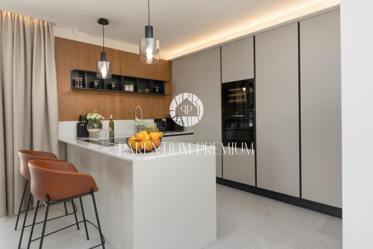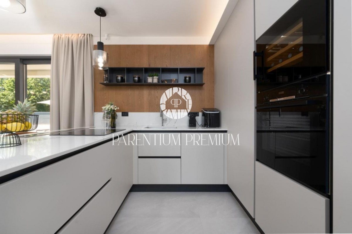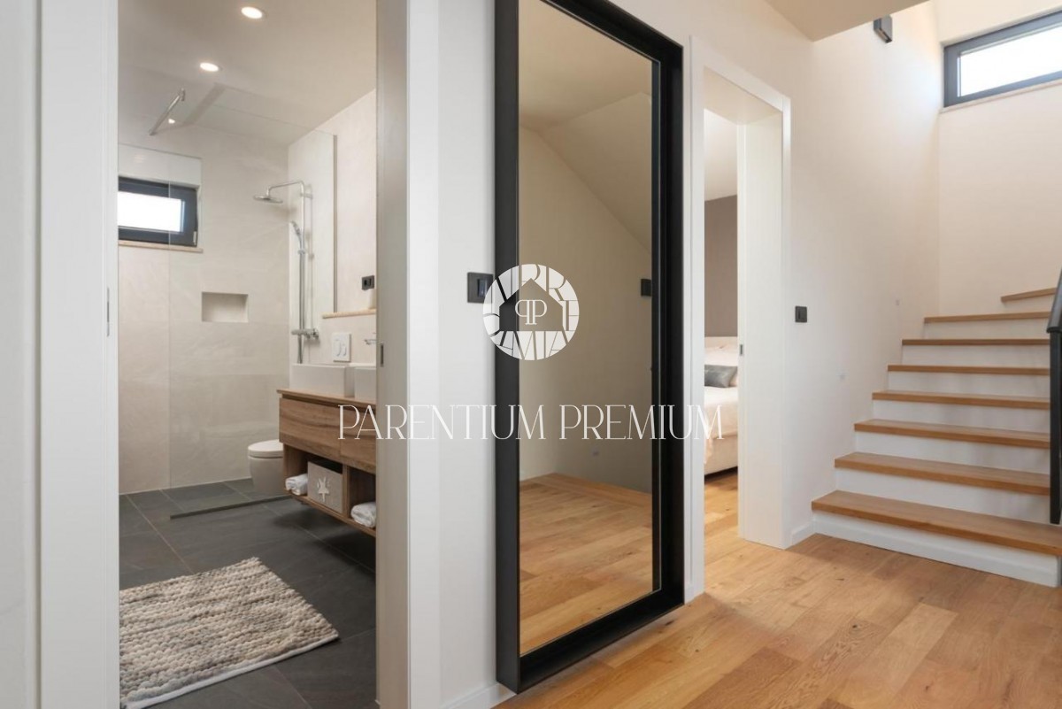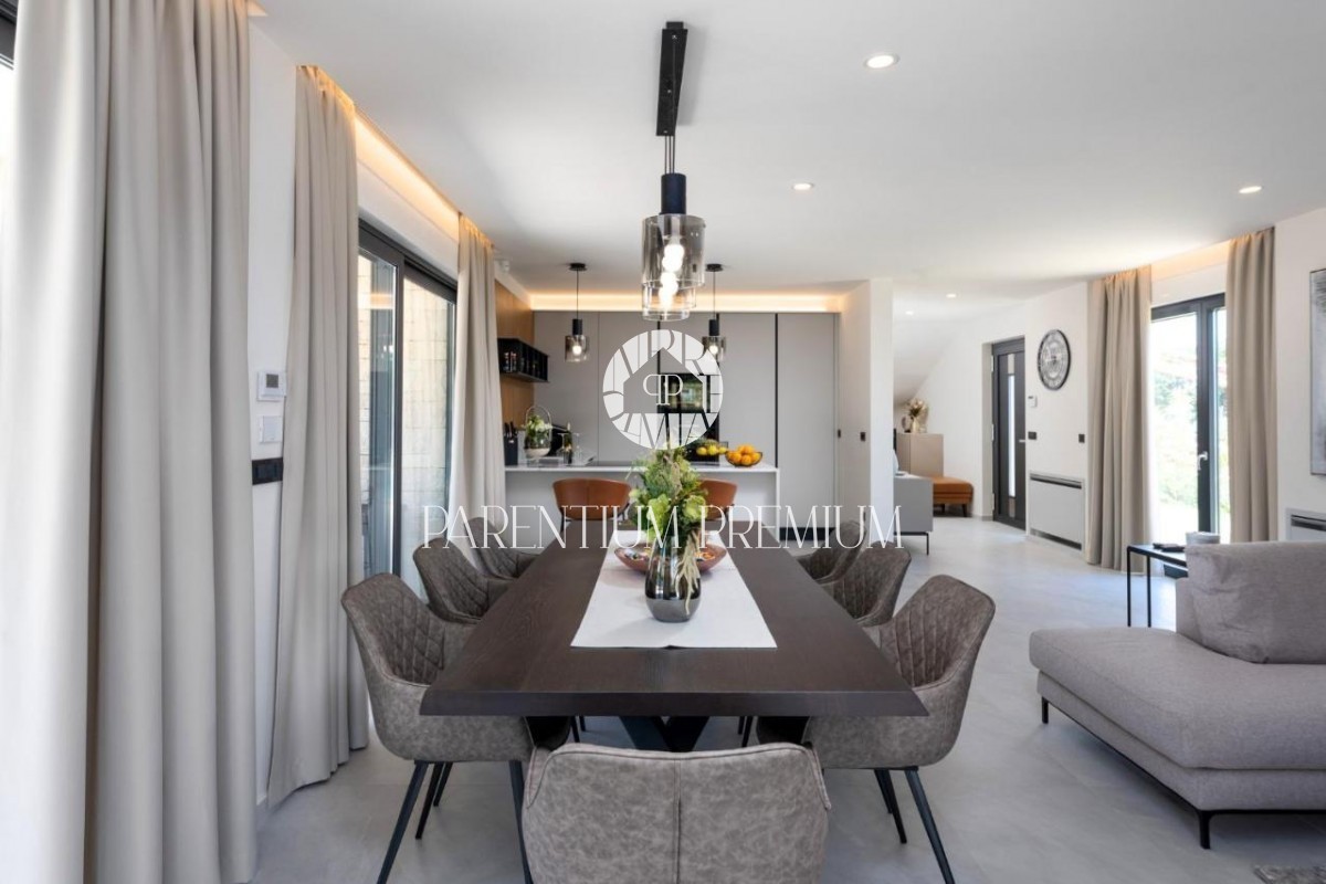 U prizemlju se nalazi ostava, kupaonica, kuhinja sa blagovaonicom i dnevnim boravkom po open space konceptu sa izlazom na natkrivenu terasu sa ljetnom kuhinjom, sunčalište s bazenom od 50m2 i dvorište. Na prvi kat se može vanjskim ili unutarnjim stepenicama gdje se nalaze tri spavaće sobe, od kojih master bedroom ima vlastitu kupaonicu, dok druge dvije spavaće koriste zajedničku prostranu kupaonicu, sve spavaće sobe imaju izlaz na veliku terasu od cca. 70m2.