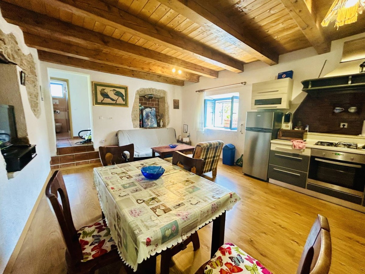 Unutrašnjost kuće raspolaže s tri spavaće sobe i orijentacijom prema jugozapadu, omogućujući obilje prirodnog svjetla i topline tijekom cijelog dana. Prostor je opremljen funkcionalnom kuhinjom s aparatima, perilicom posuđa, perilicom rublja, televizorom, krevetom i radnim stolom, što zadovoljava potrebe suvremenog života.