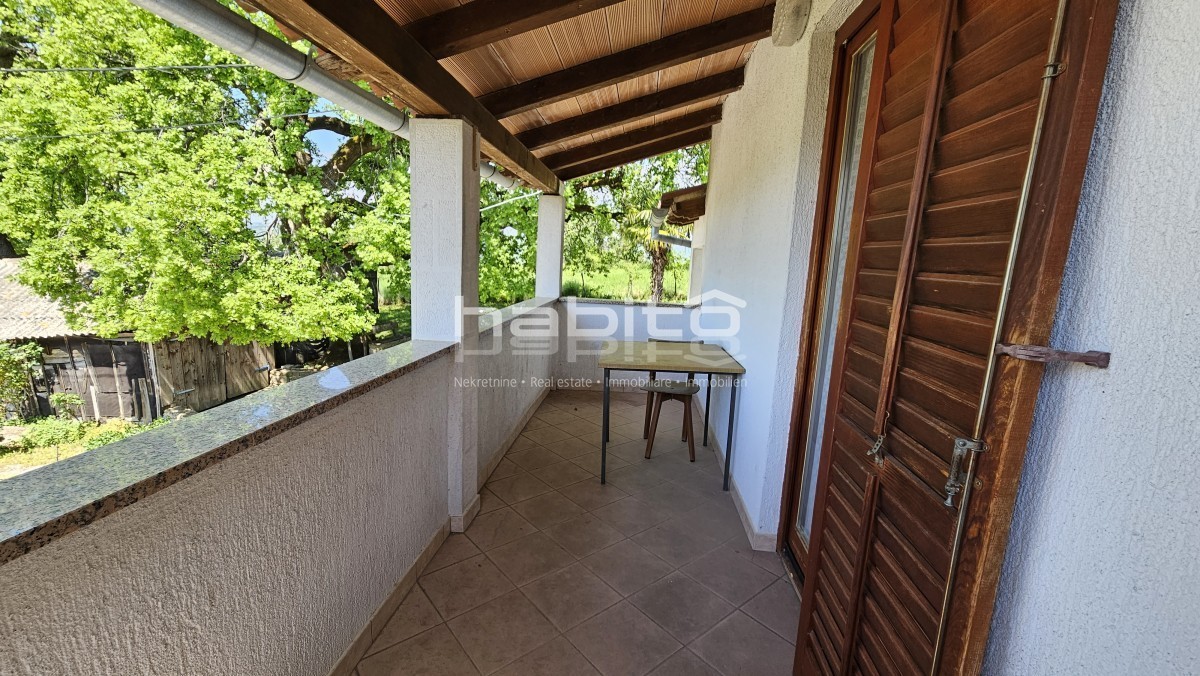 Prizemlje kuće sastoji se od ulaznog hodnika, kupatila, kuhinje, dnevnog boravka, dvije spavaće sobe i balkona od ca. 7 m2 koji pruža prekrasan panoramski pogled na unutrašnju Istru.