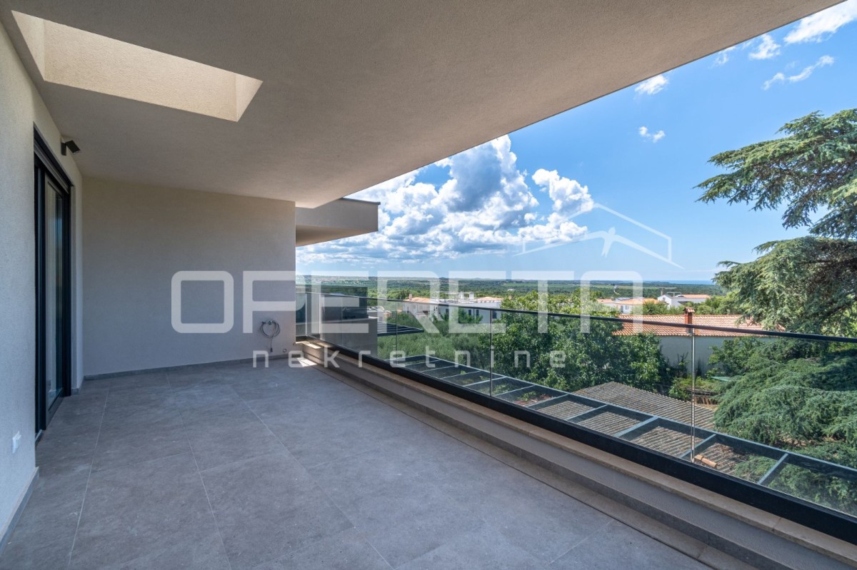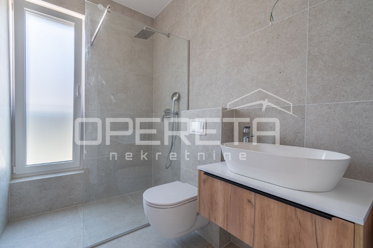 Donja etaža stana sastoji se od elegantnog predsoblja, jedne spavaće sobe s vlastitom kupaonicom, garderobe te praktične praonice s toaletom. Unutarnje stepenište vodi na gornju etažu, gdje dominira prostrani dnevni boravak s kuhinjom i blagovaonicom u otvorenom konceptu. Na istoj etaži nalaze se još dvije spavaće sobe i dvije kupaonice, čime se osigurava maksimalna privatnost za sve stanare. Iz dnevnog dijela izlazi se na natkrivenu terasu površine 15 m² s koje se pruža očaravajući, otvoren pogled na more, idealan za trenutke opuštanja.