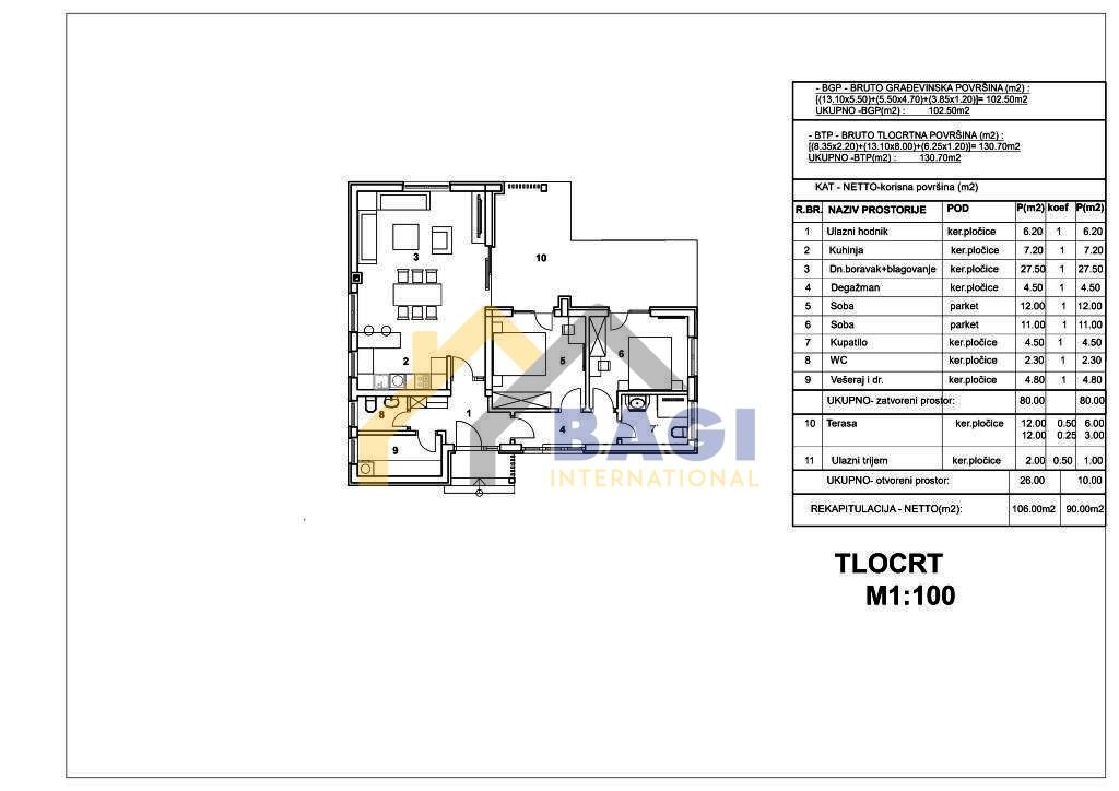 Sastoji se od ulaznog hodnika,kuhinje,dnevnog boravka sa blagovaonom,