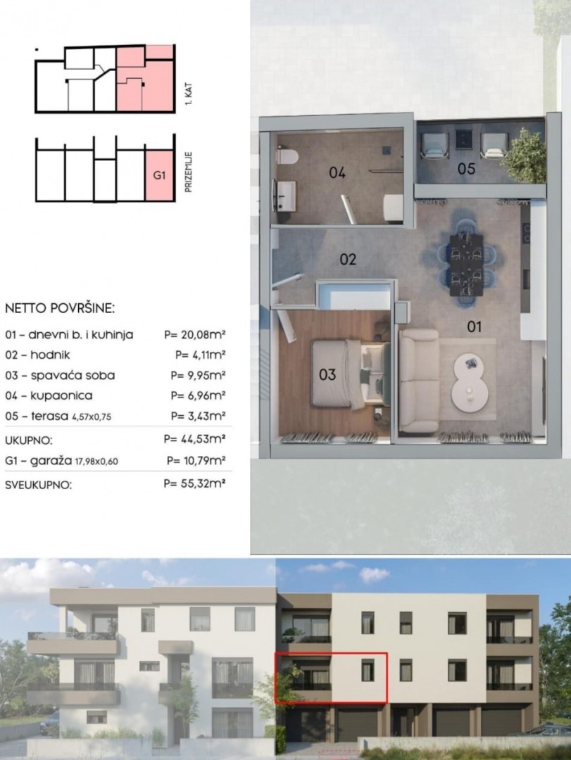 U ponudi je moderan stan smješten na prvom katu zgrade, ukupne neto površine 55,32 m2 koja uključuje stambeni prostor, terasu i garažu.