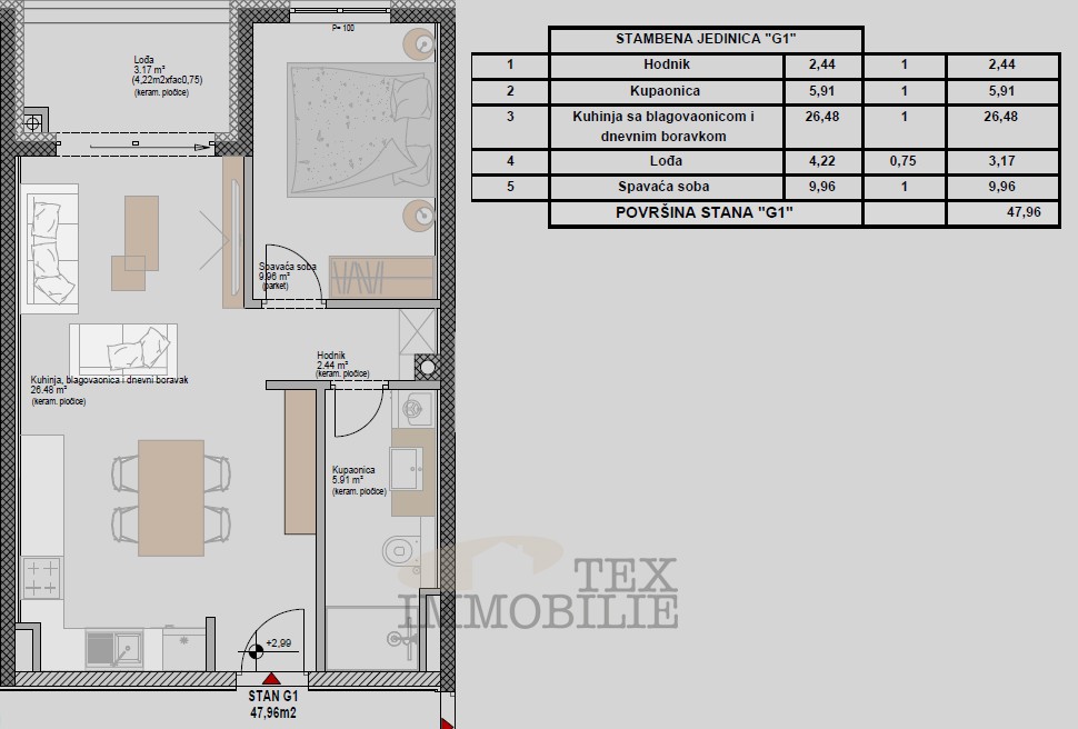 Stan je pametno i funkcionalno projektiran te se sastoji od svijetlog dnevnog boravka s kuhinjom i blagovaonicom (26,48 m²), jedne spavaće sobe, kupaonice i lođe koja pruža lijep prostor za jutarnju kavu ili opuštanje na svježem zraku.