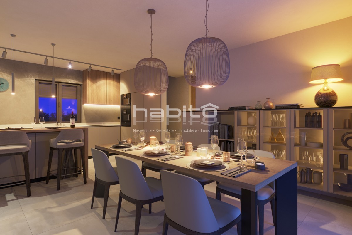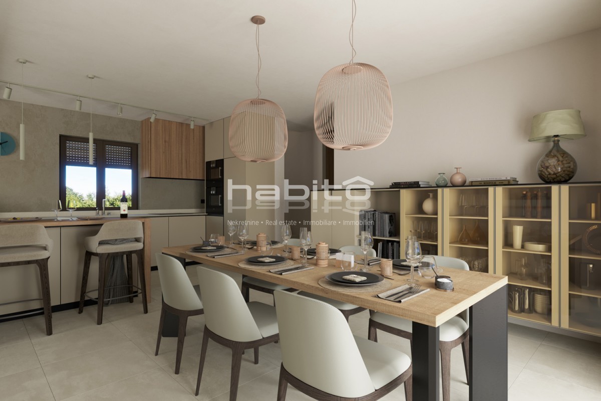 Kuća je udaljena samo 2.5 km od centra Višnjana i 13 km od mora i Poreča. Postoji mogućnost kupnje kuće u roh bau fazi po cijeni od 363.000 €. Idealna prilika za prilagodbu interijera po vlastitoj želji.