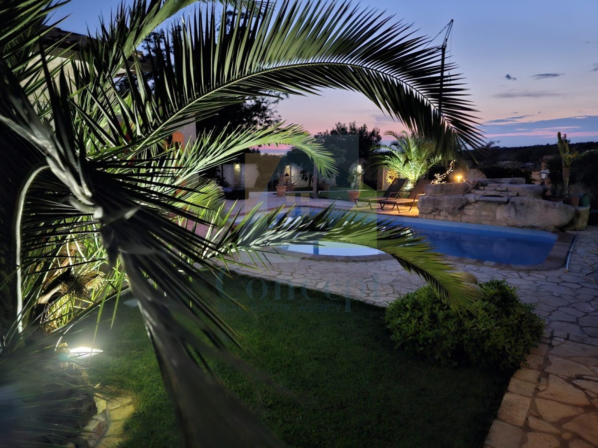 U uređenom vrtu s pogledom na more smješten je bazen s vodopadom, a uz njega se nalazi konoba s kaminom, dodatnom kuhinjom i toaletom, pogodna za boravak i druženje tijekom toplijih mjeseci.