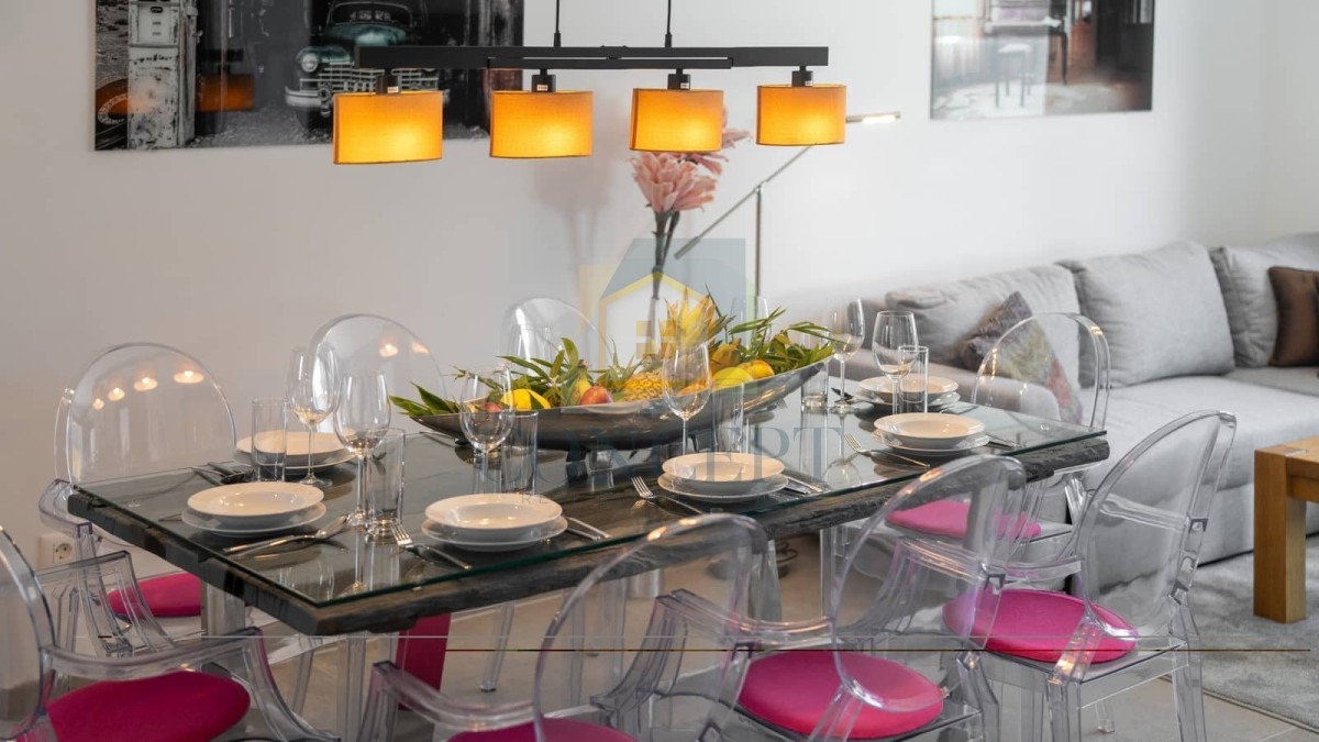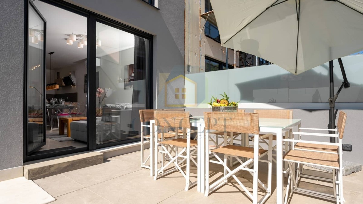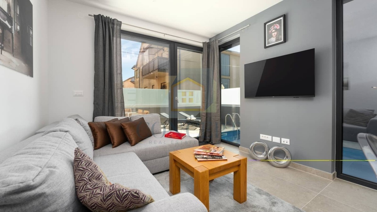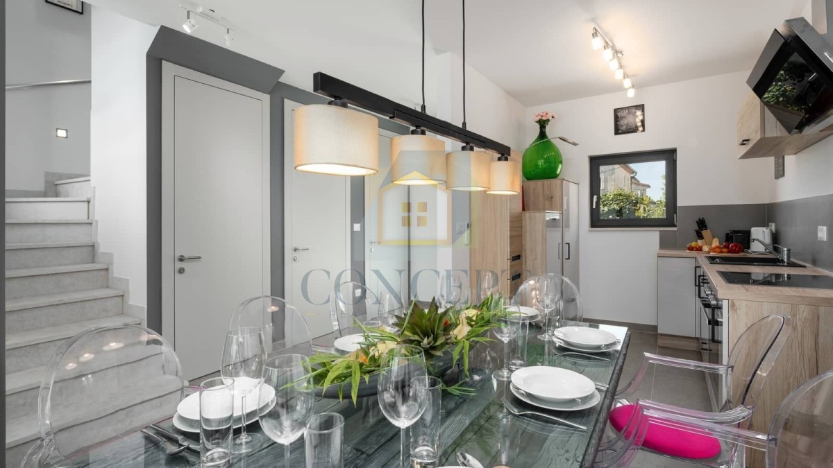 U sklopu kuće nalazi se privatno parkiralište, otvoreni bazen površine 15 m² te mirno dvorište koje pruža potpunu privatnost. Terasa s garniturom za sjedenje i sunčalište uz bazen savršeni su za uživanje tijekom toplih ljetnih dana. Kuća je opremljena klima uređajima.